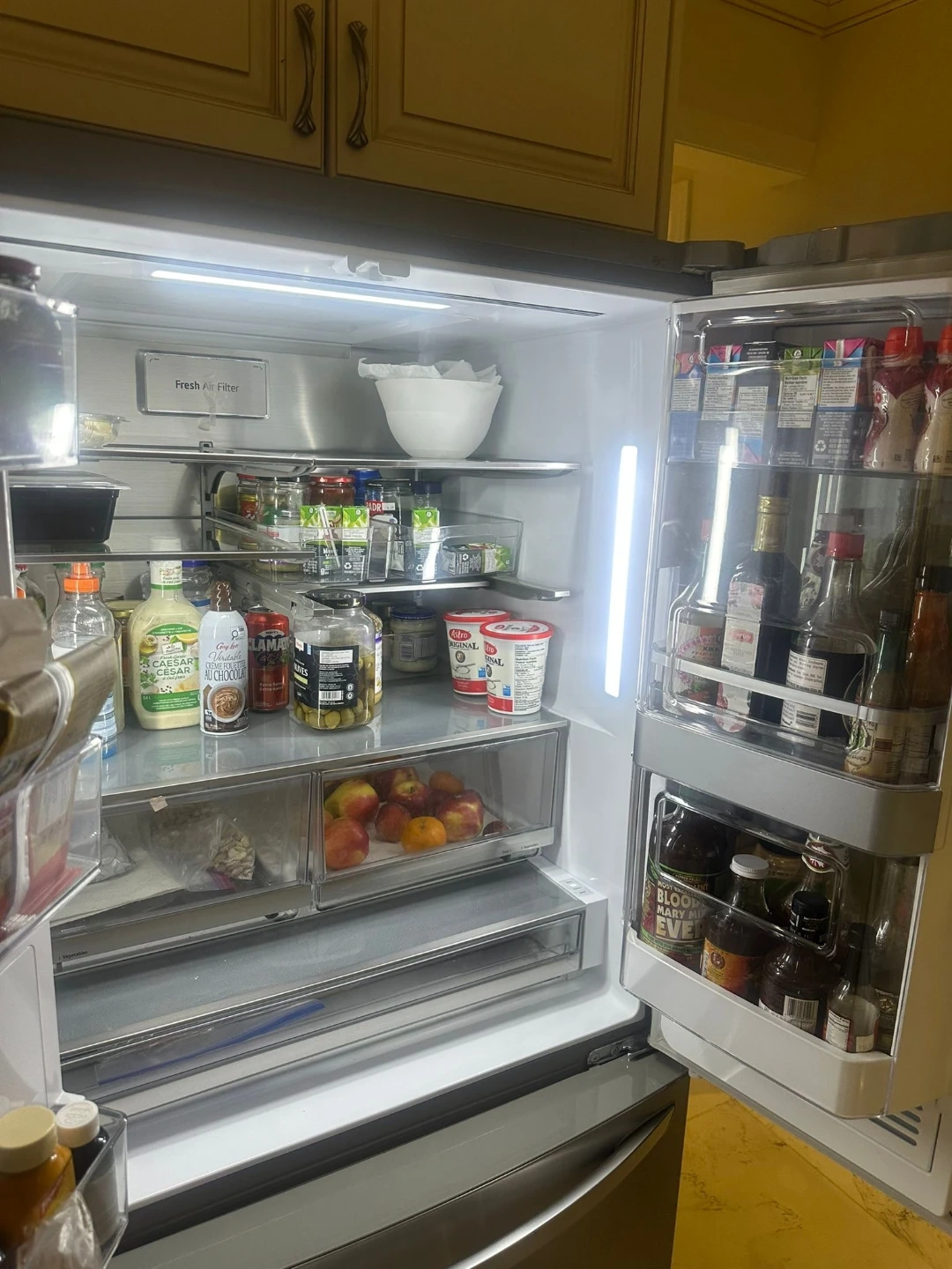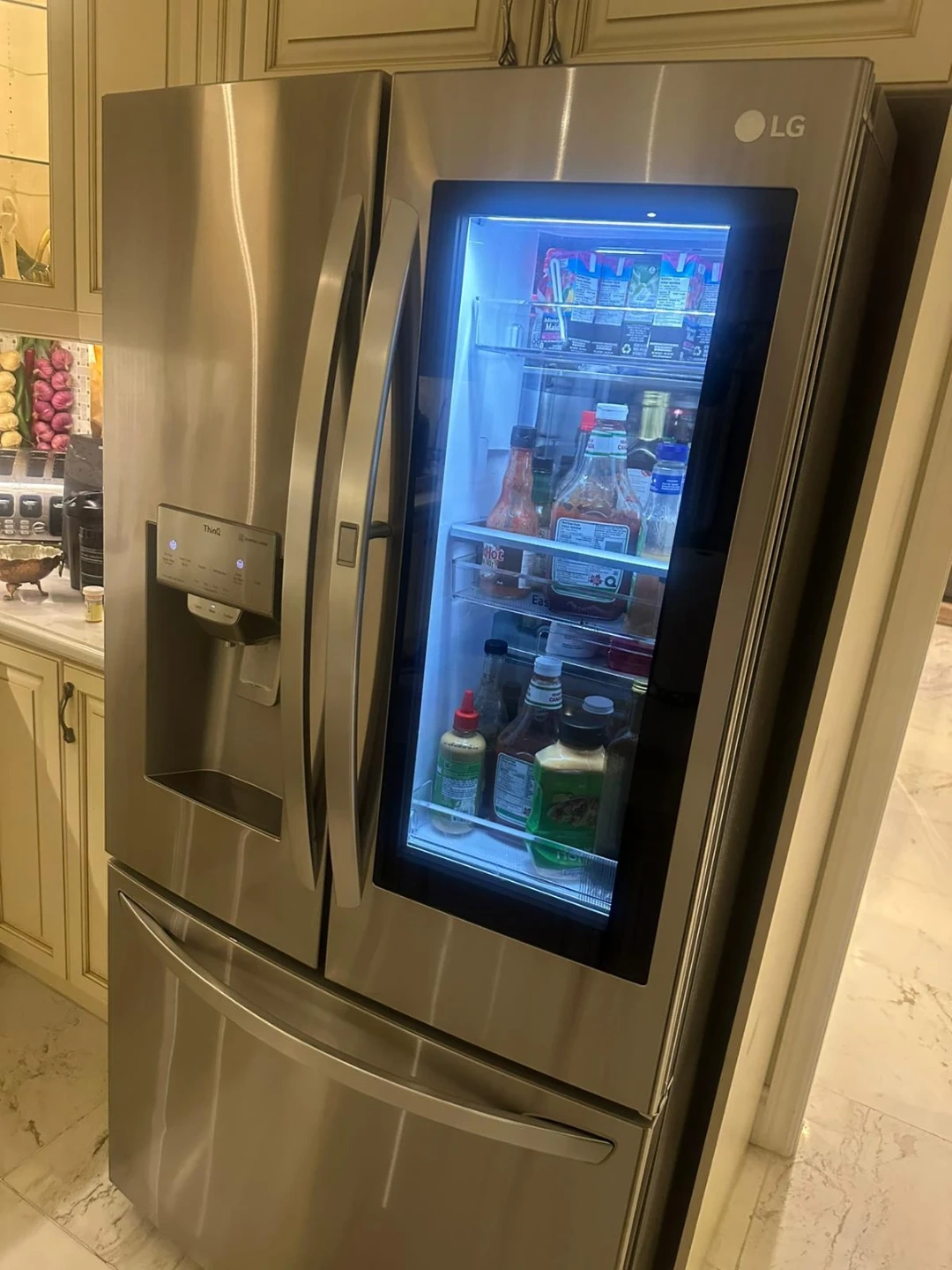 This LG InstaView French door refrigerator features a see-through glass panel that illuminates with two quick knocks, letting you see inside without opening the door. It offers ample storage with adjustable shelves and door bins, plus a convenient Door-in-Door section for frequently accessed items. The stainless steel finish provides a sleek look for any kitchen.