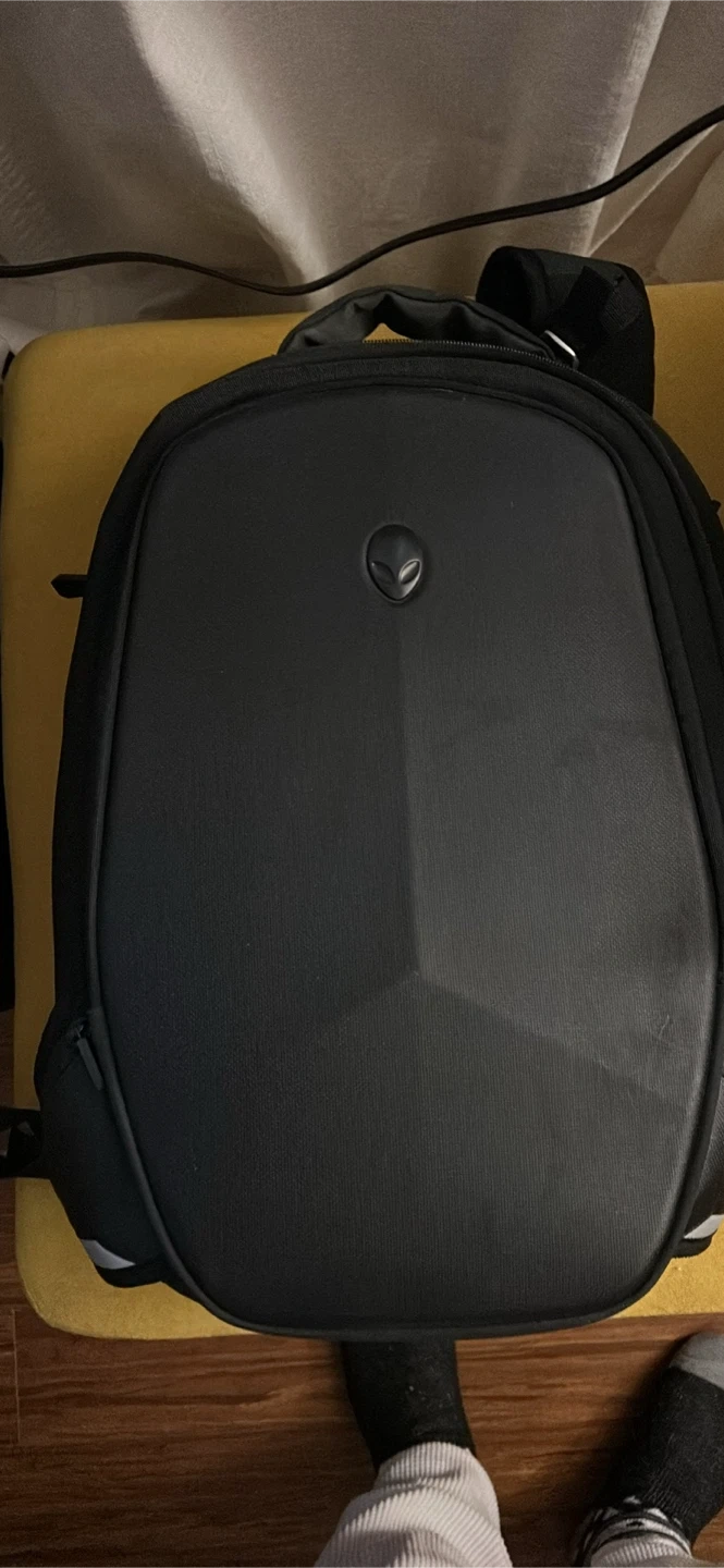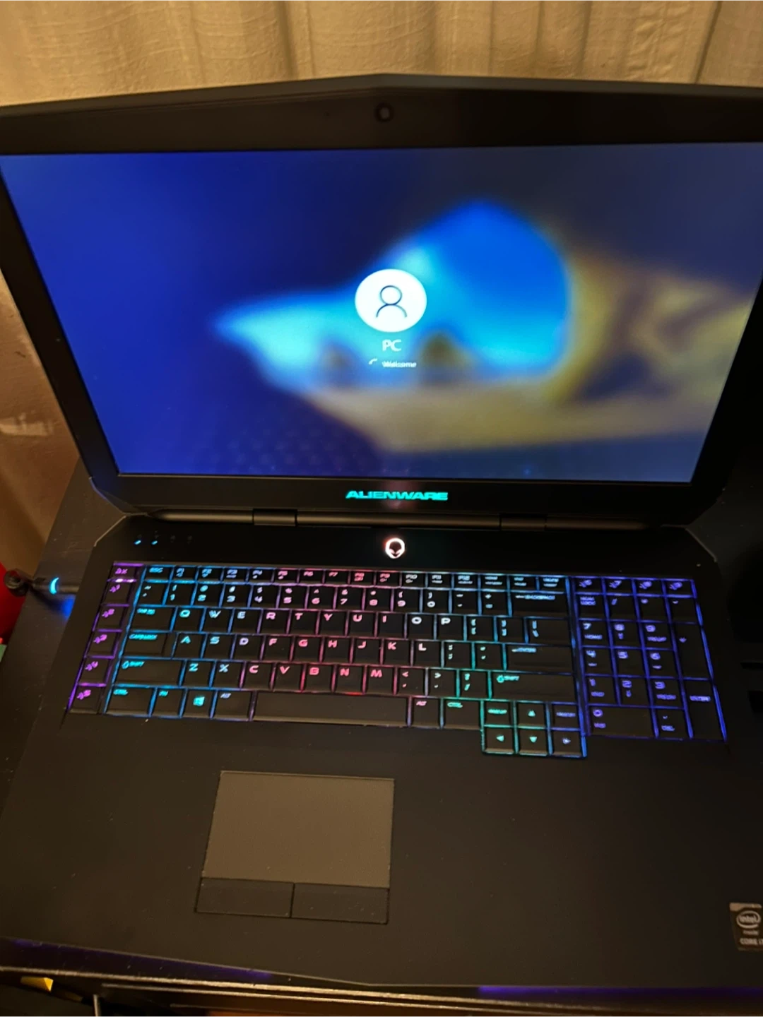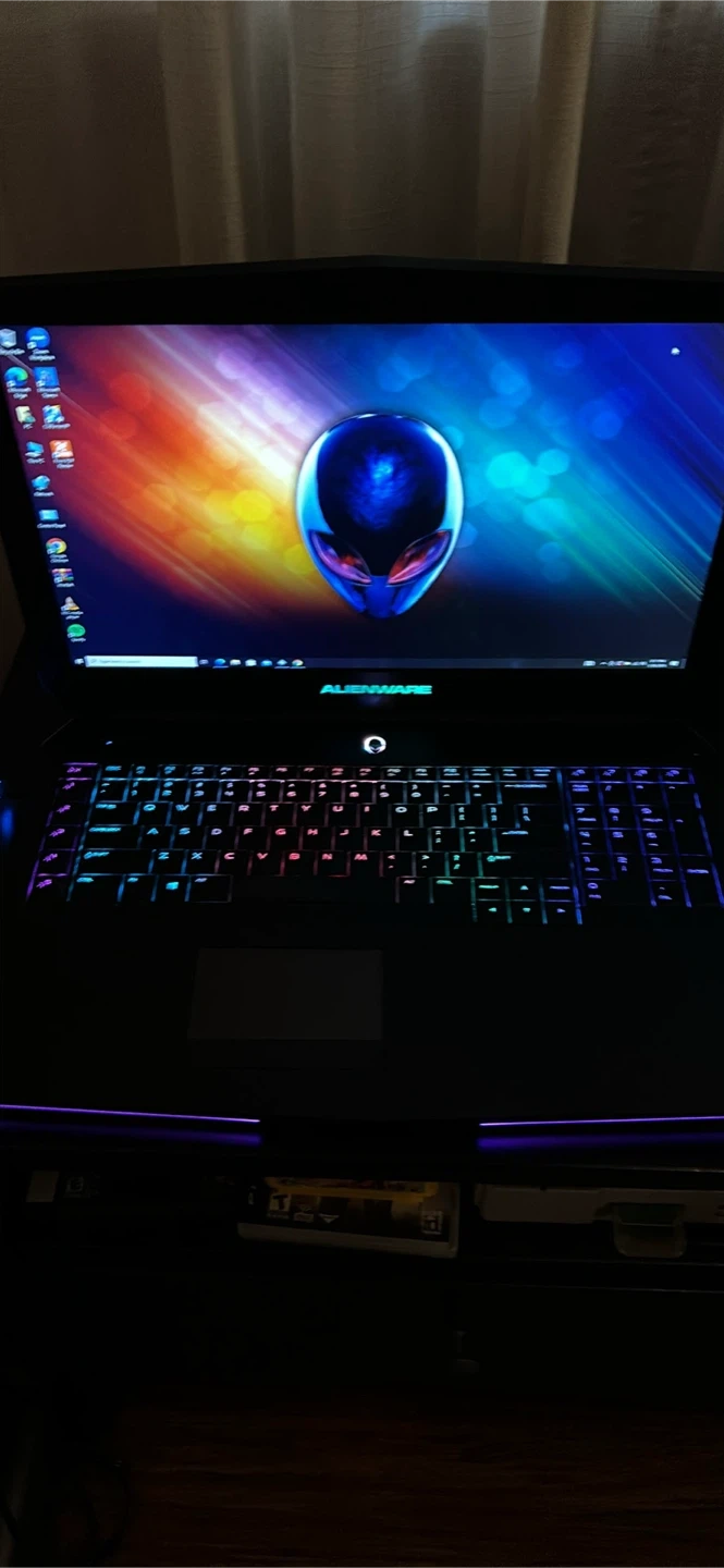 This is an Alienware laptop with a colourful backlit keyboard. It's a powerful machine ready for gaming or demanding tasks. It comes with an Alienware branded backpack, perfect for transporting your laptop safely.