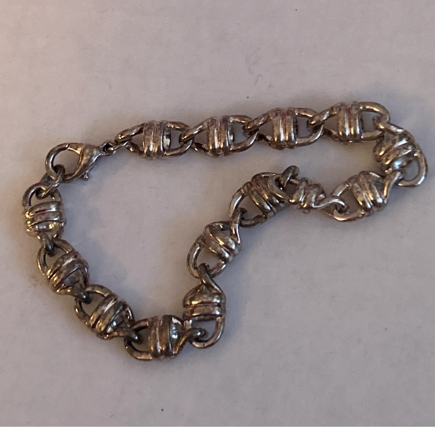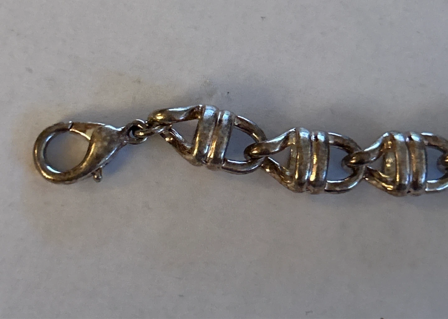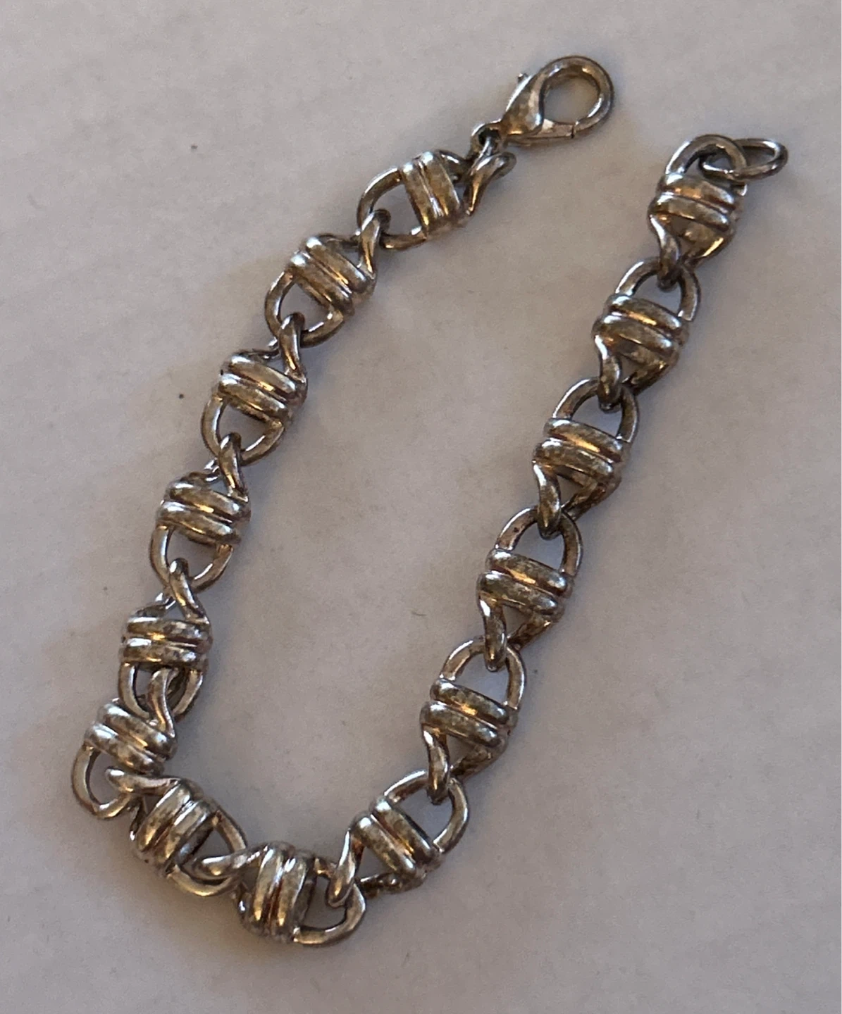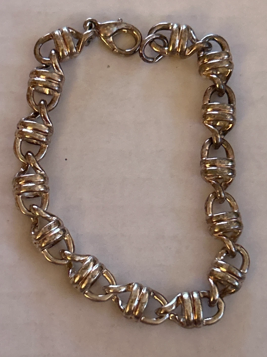 Selling a silver chain bracelet with a unique interlocking link design. It features a secure lobster clasp closure. This bracelet adds a touch of classic style to any outfit!