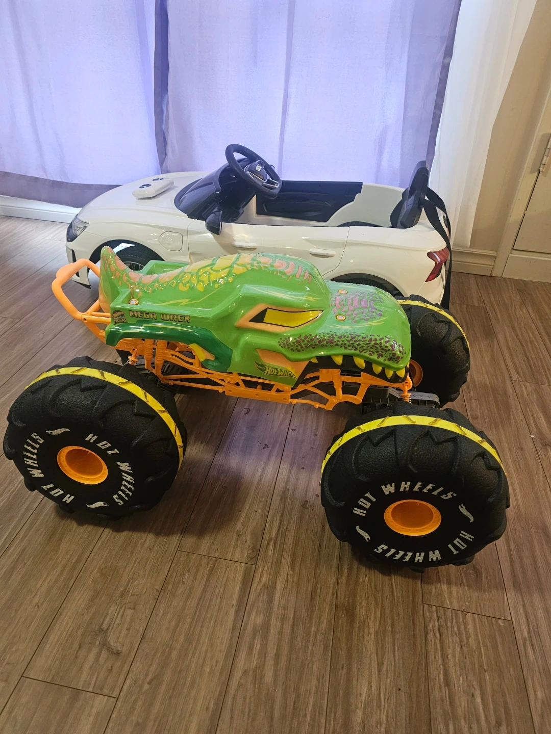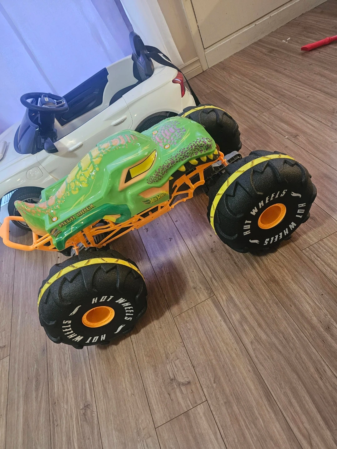 This Hot Wheels Mega Wrex monster truck is ready for action! It's a vibrant green with orange accents and oversized wheels. A cool toy for any monster truck fan!
