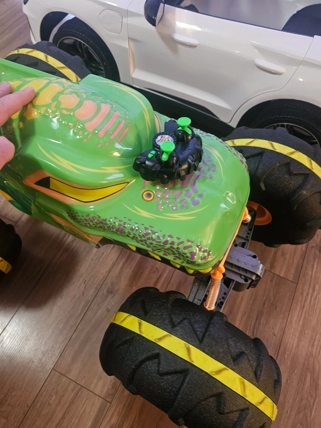 This Hot Wheels Mega Wrex monster truck is ready for action! It's a vibrant green with orange accents and oversized wheels. A cool toy for any monster truck fan!
