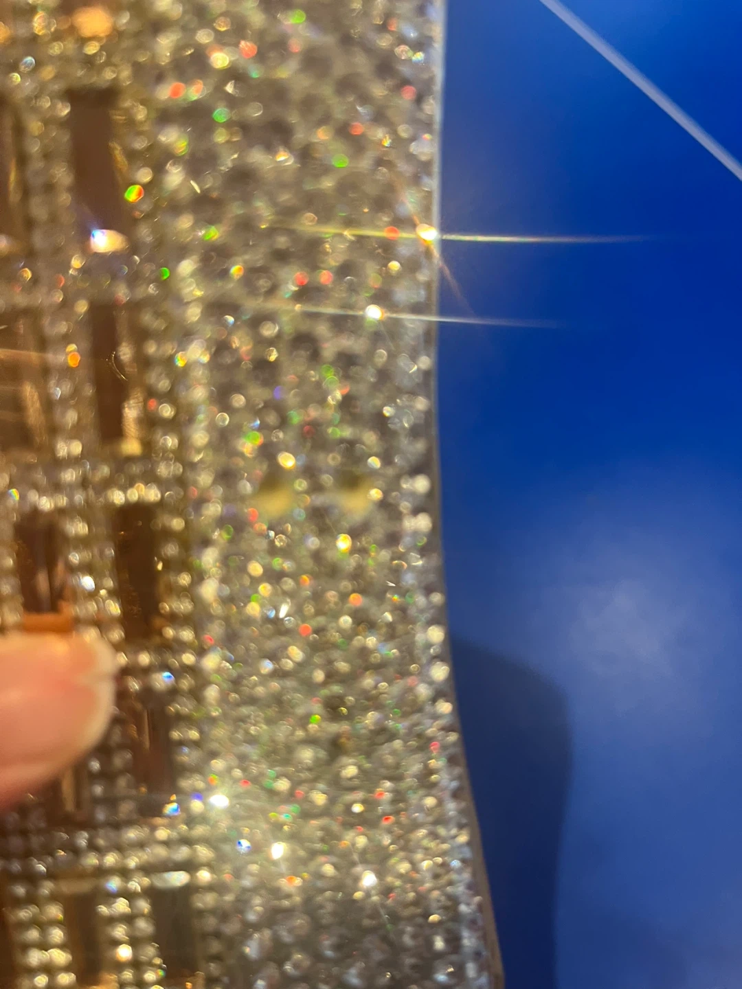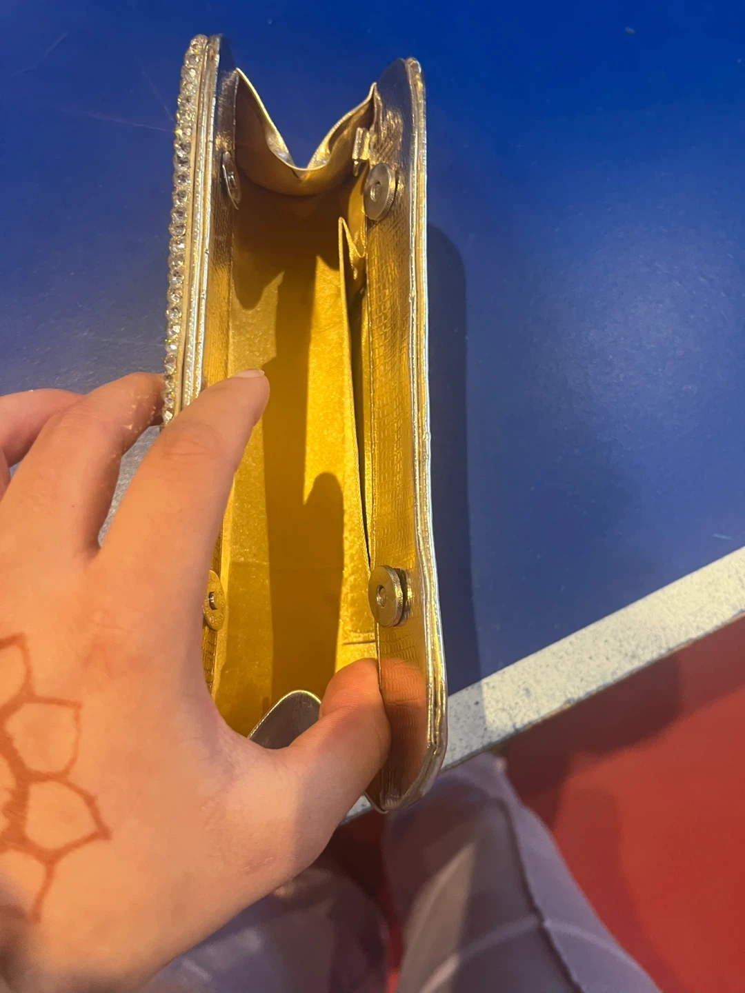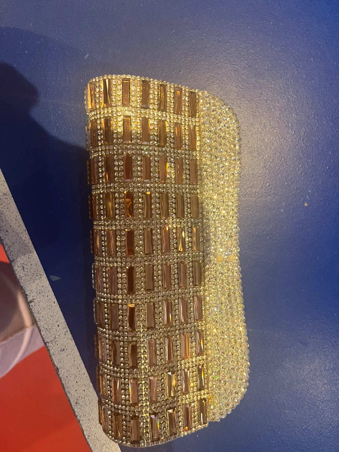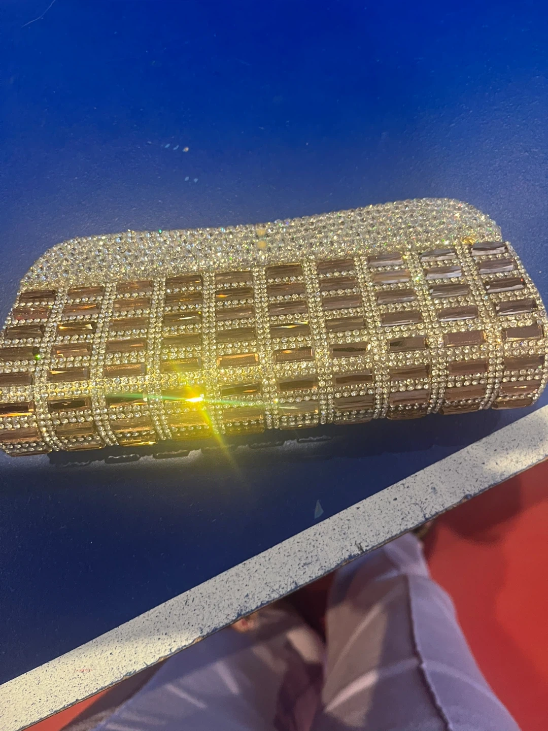 A sparkly clutch purse adorned with rhinestones and larger amber-toned gems in a grid pattern. Its interior is a golden satin material. It's a great accessory for formal events or evenings out!