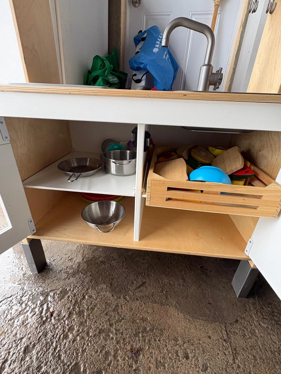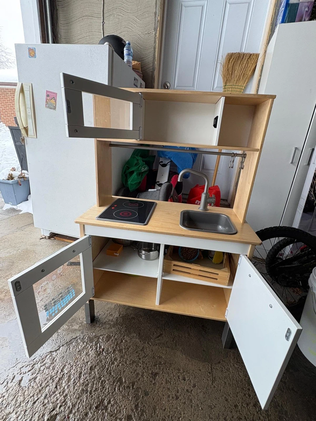 IKEA kid's play kitchen features a stovetop, sink, and microwave. It includes various play pots, pans, and a wooden crate of colourful dishes, food, and other accessories.
