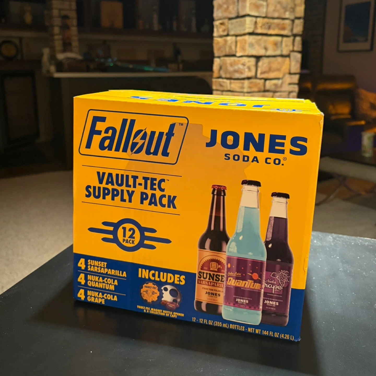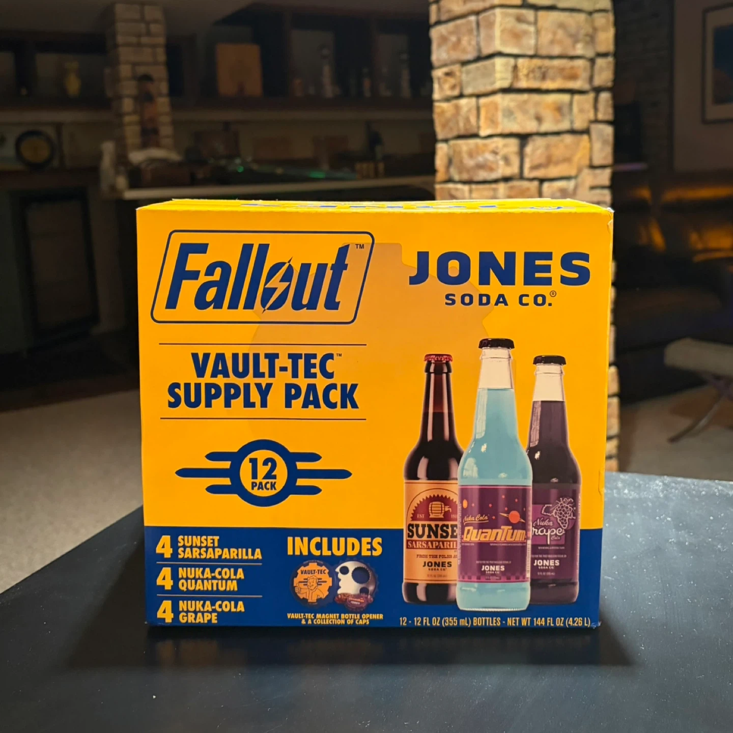 This is the rare Jones Soda Co. Fallout Vault-Tec Supply Pack containing 12 bottles. It includes 4 Sunset Sarsaparilla, 4 Nuka-Cola Quantum, and 4 Nuka-Cola Grape flavors. Each bottle is 12 fl oz (355 ml). Includes bottle opener and 3 bottle caps for each flavour.
