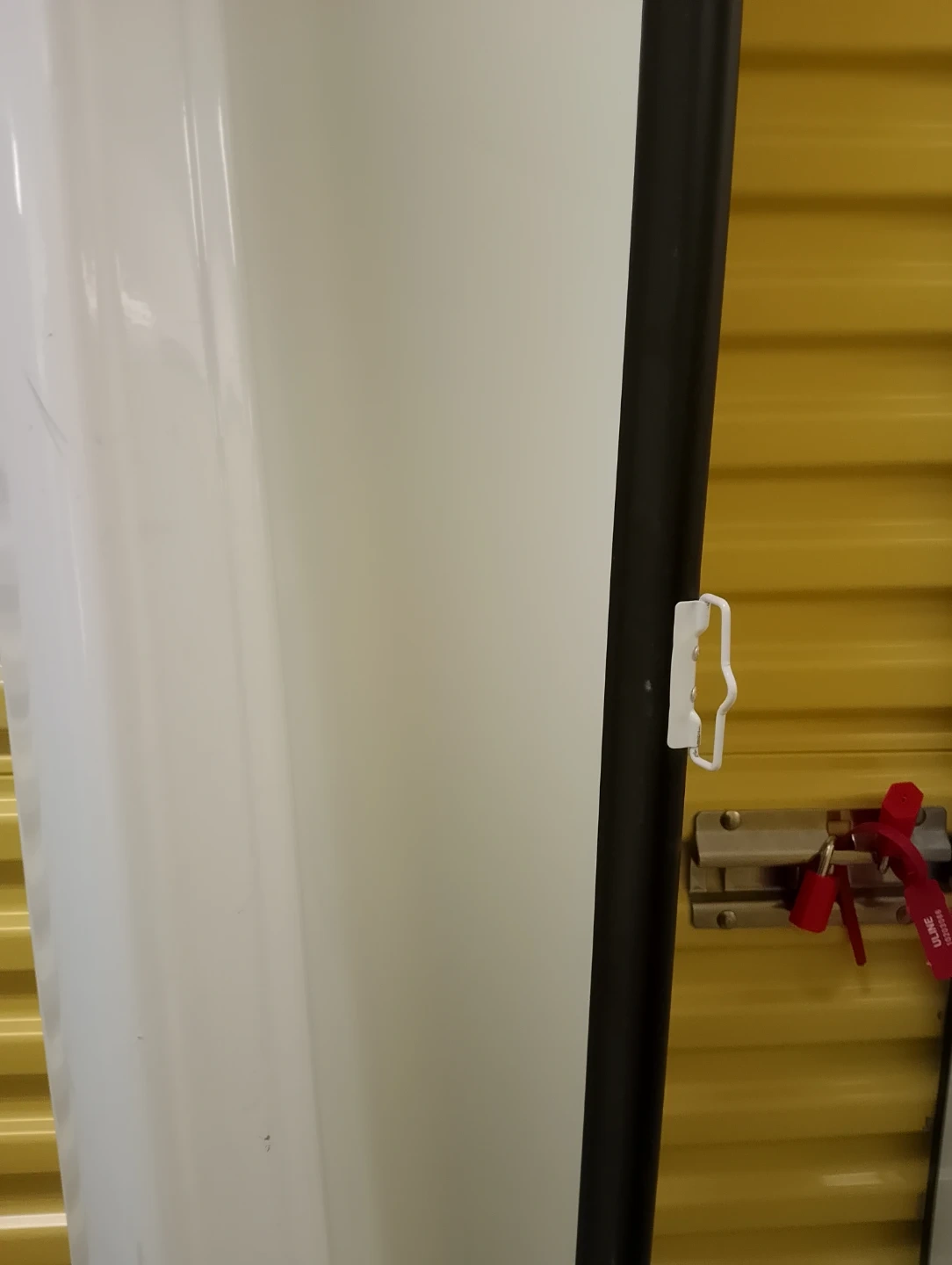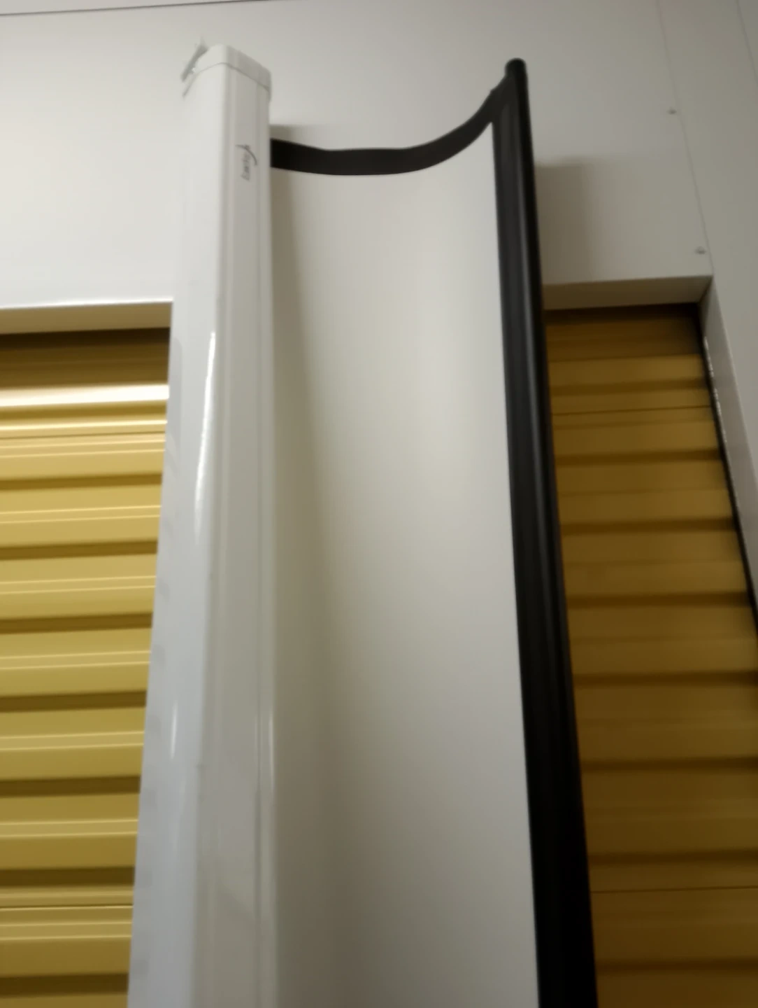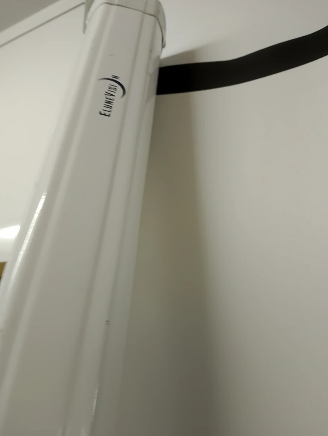 This is an Elunevision Vision 200 projector screen. It's white with a black trim. The screen material is suitable for home theatre viewing.