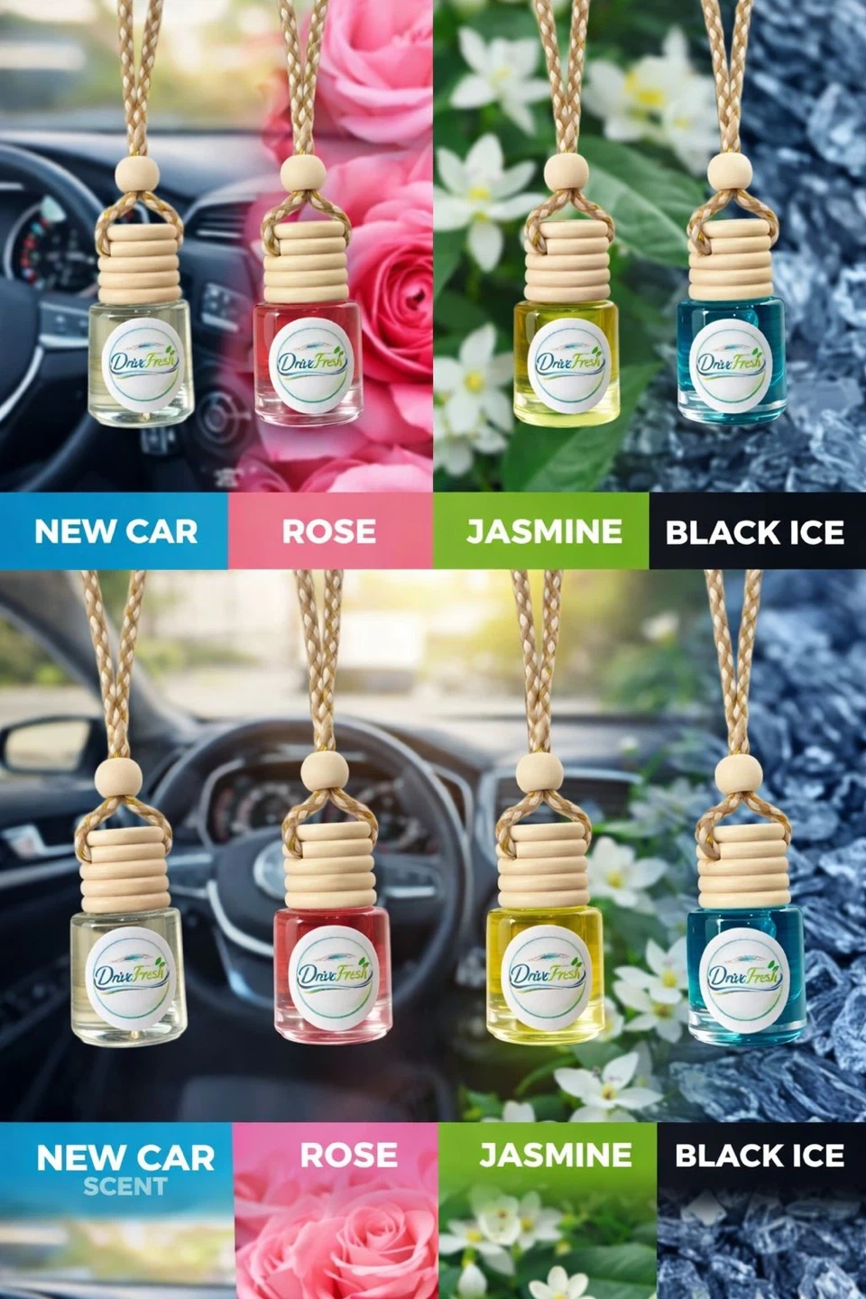 Set of four Drive Fresh car air fresheners. Scents include New Car, Rose, Jasmine, and Black Ice. Each has a wooden cap and hangs from a rope. These fresheners are great for keeping your car smelling nice!!!