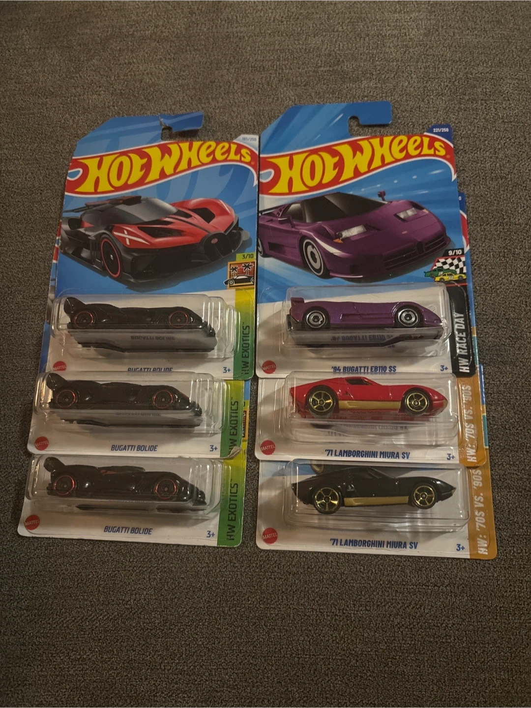 Three Hot Wheels Bugatti Bolide cars and two '71 Lamborghini Miura SV cars. Also includes a purple '94 Bugatti EB110 SS. All are 1:64 scale. $10 each.