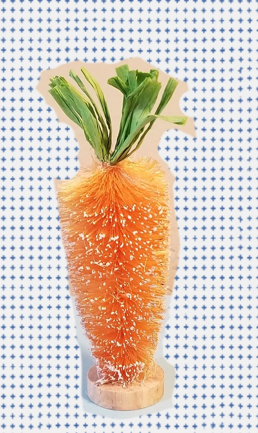 Aldi's brand: Kirkton house: bottlebrush carrots for seasonal decor. Carrot measures 5.375 inches in height and 2 inches in diameter. These decorative items are perfect for tabletops, mantels, or shelves. Made in China.