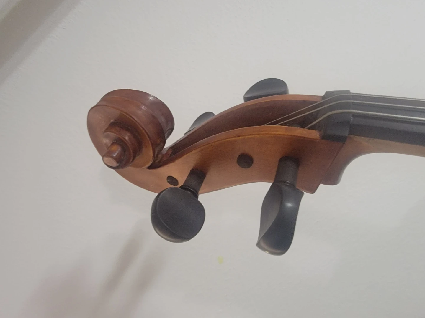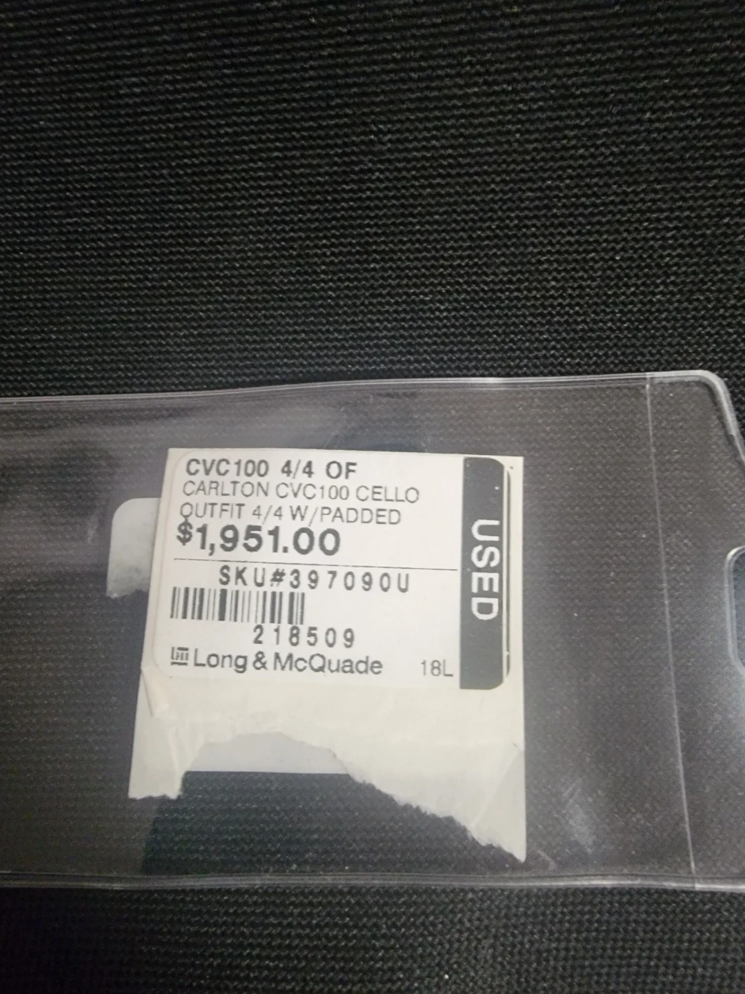 This is a 4/4 size Carlton CVC100 Cello Outfit with a padded bag. It features a wooden body and tuning pegs. There's a noticeable scratch on the surface of the cello's body. It's a nice instrument for learning or playing.