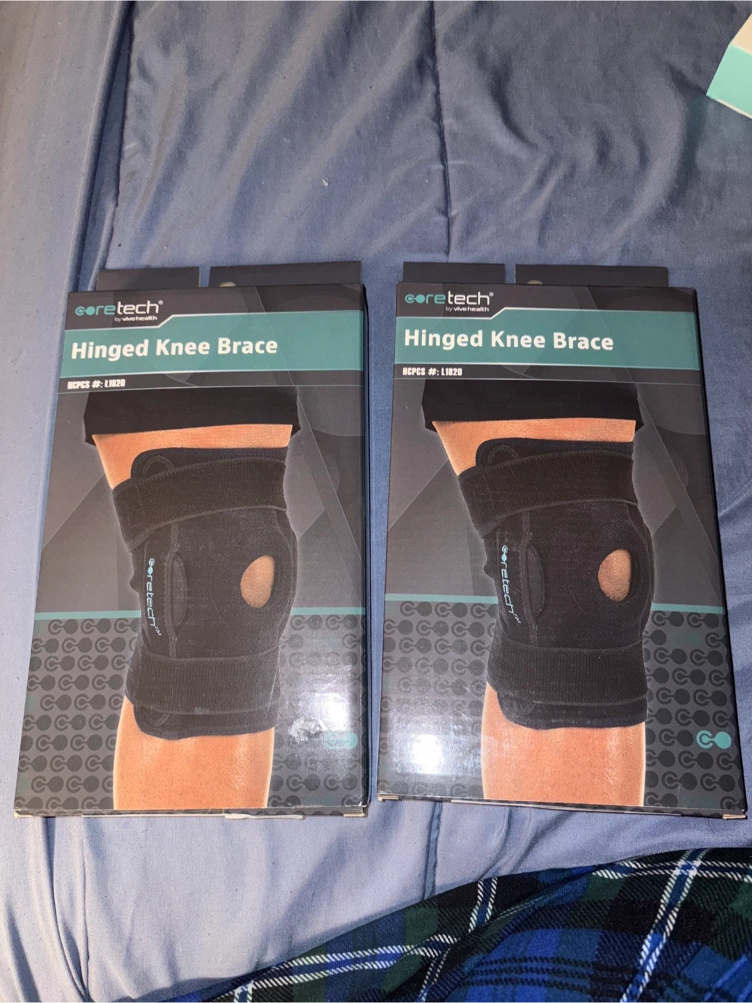 Two Coretech hinged knee braces by ViveHealth. These braces offer support and stability. Ideal for post-injury recovery or daily activity.