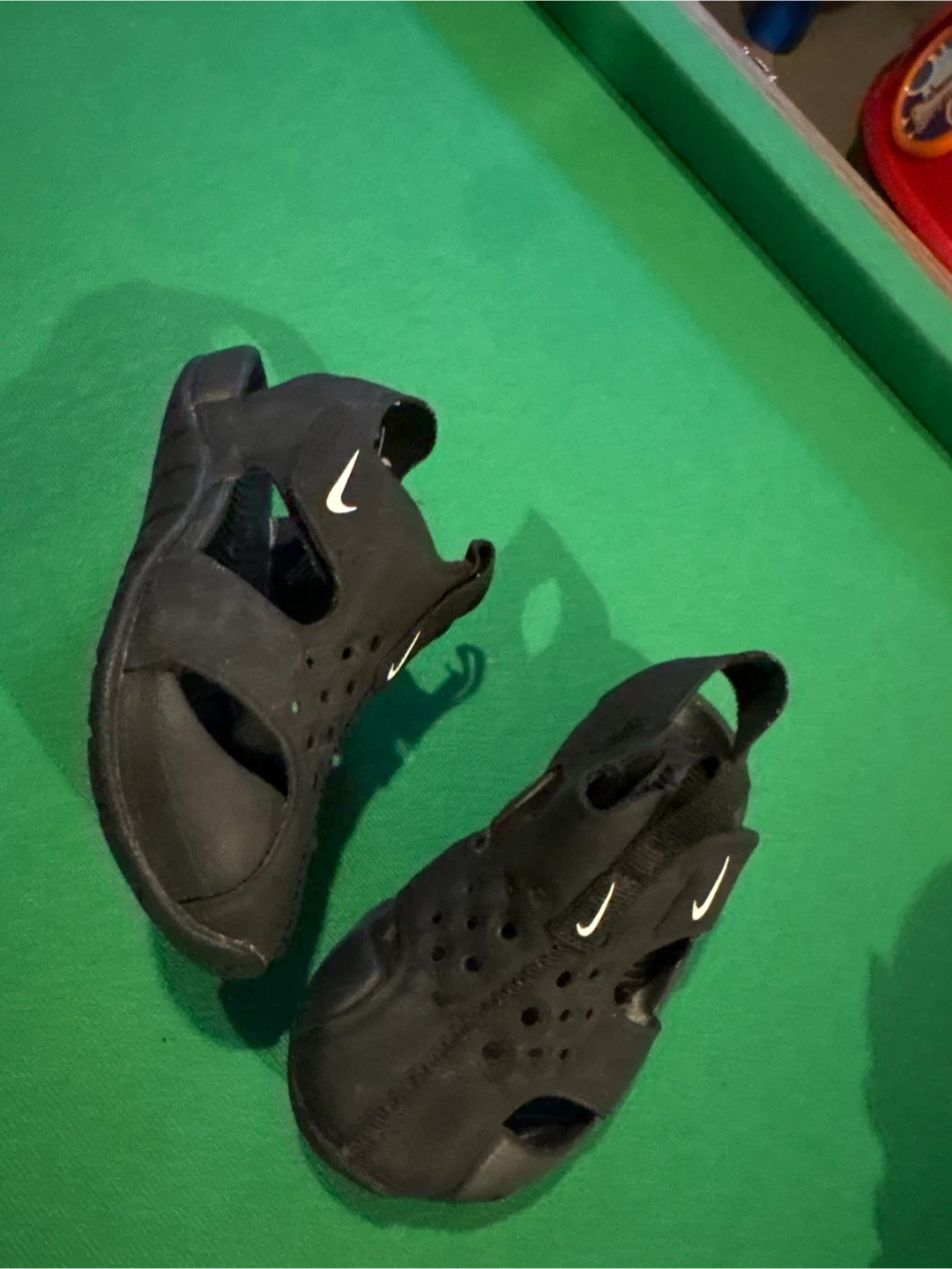 Black Nike water sandals for kids. Features a durable synthetic material and adjustable straps for a secure fit. Perfect for beach or pool days! Size 4.5 or 11cm