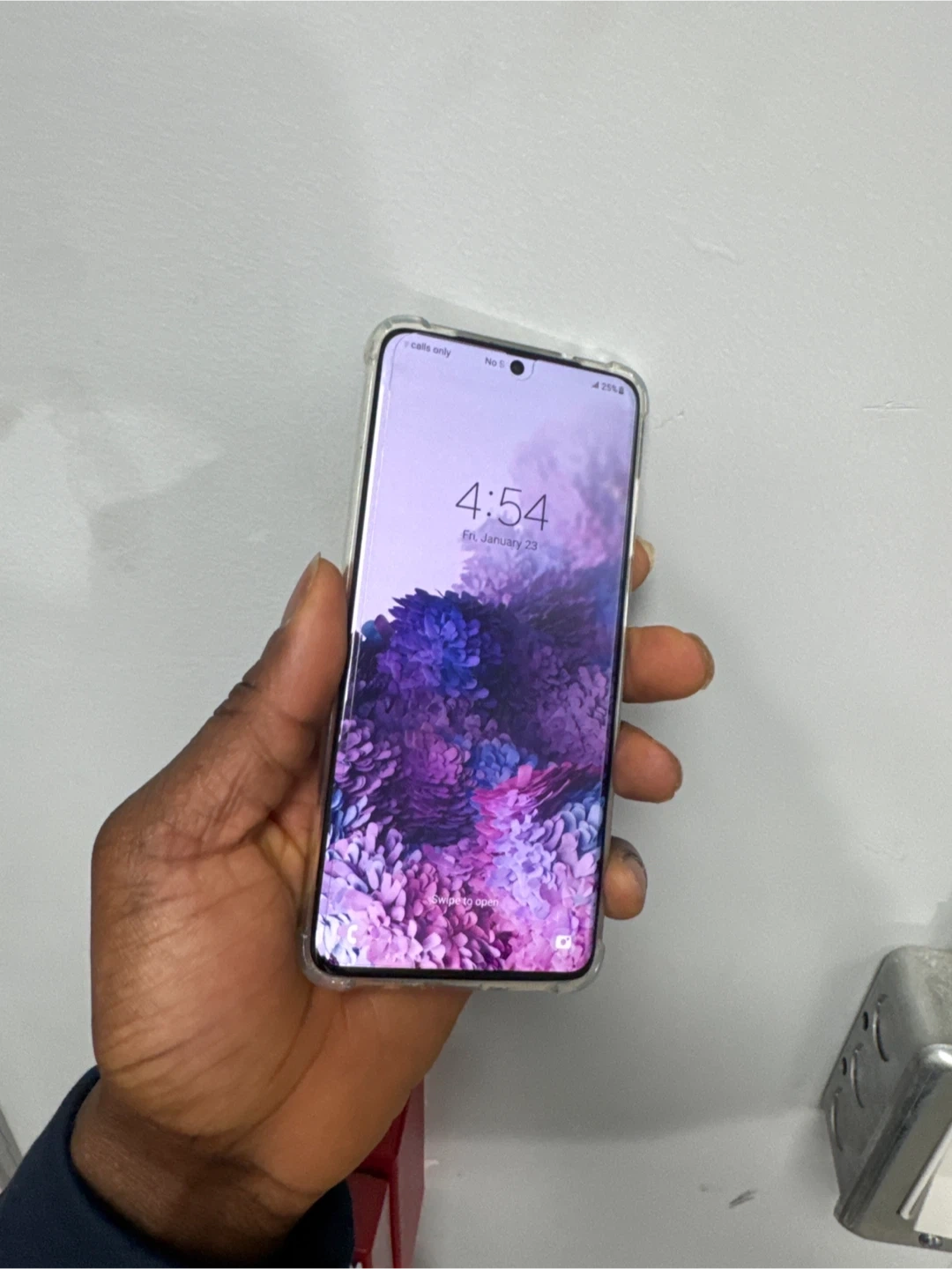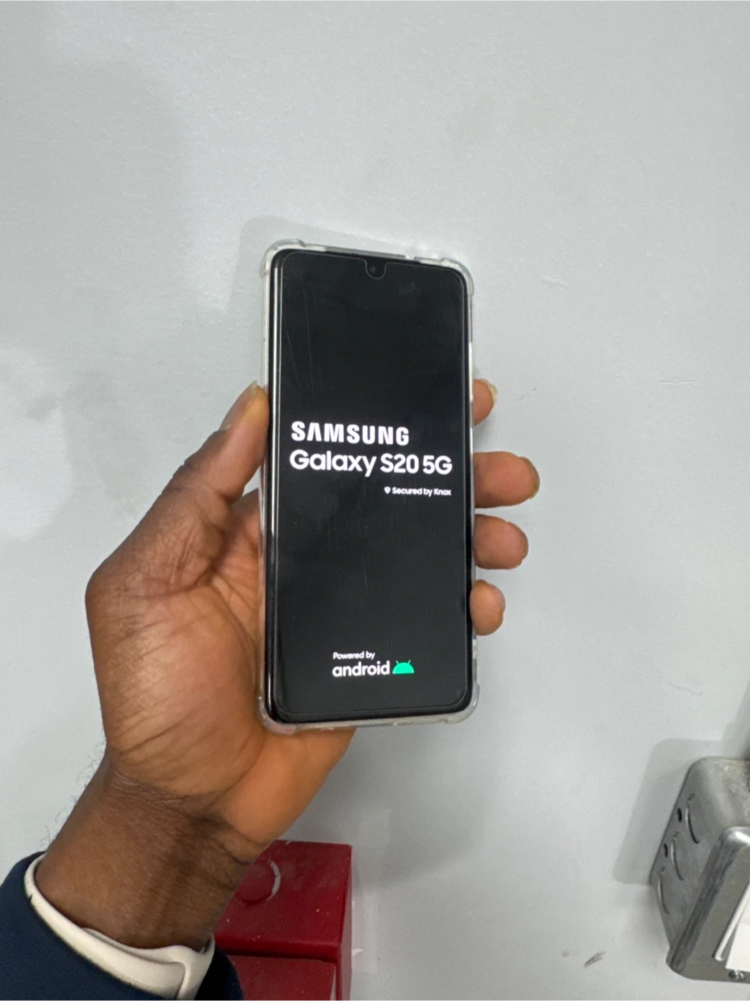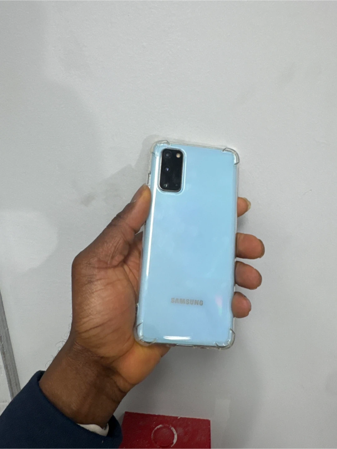 Samsung Galaxy S20 5G smartphone. This is a light blue coloured phone. It's powered by Android.