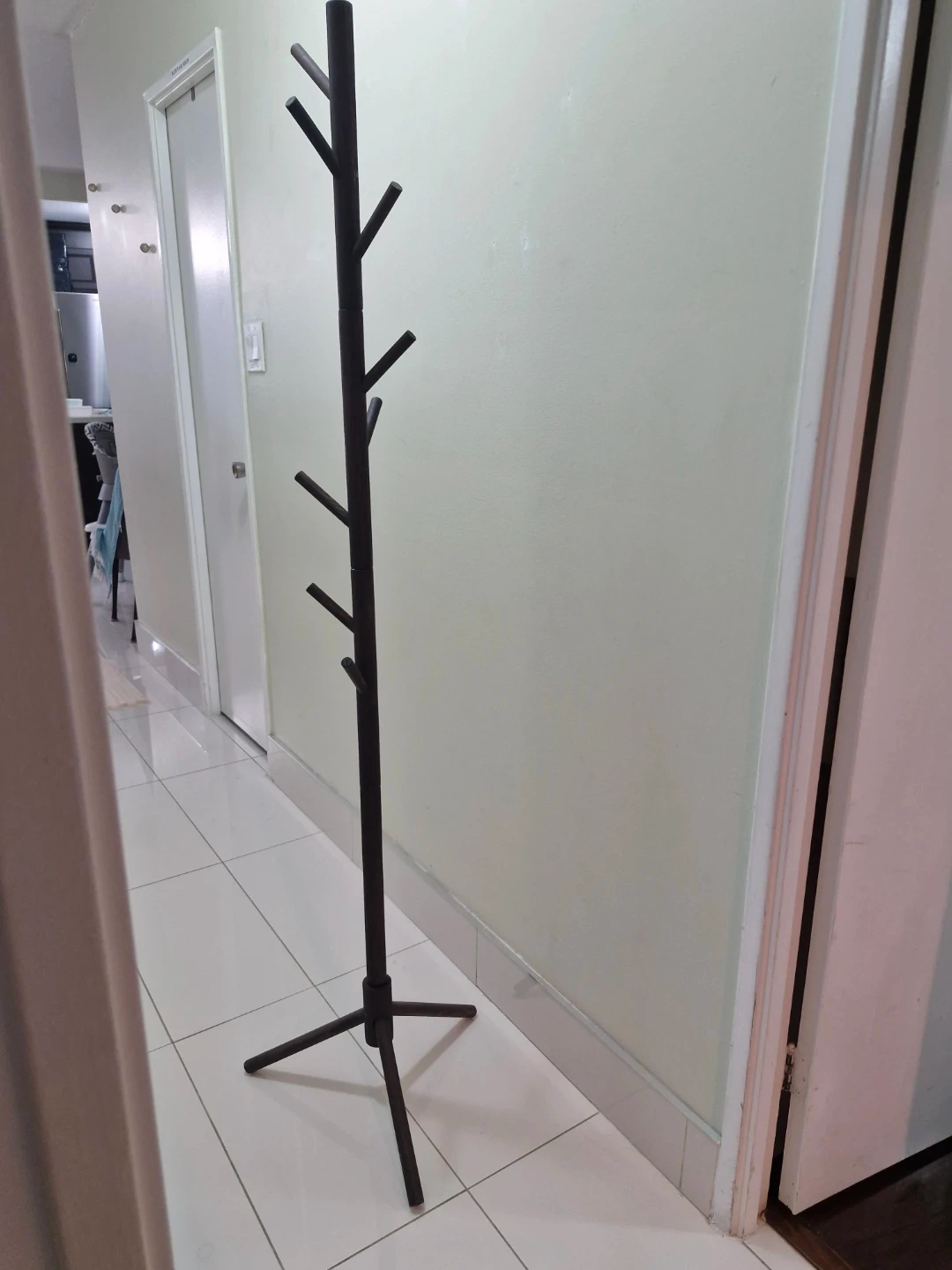 This is a dark wood coat rack with multiple branches for hanging items. It stands on a stable tripod base. It's a great way to keep your entryway tidy!