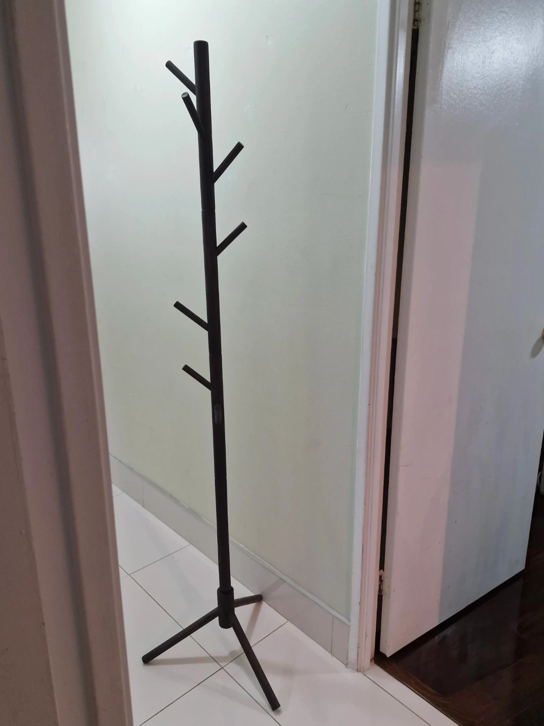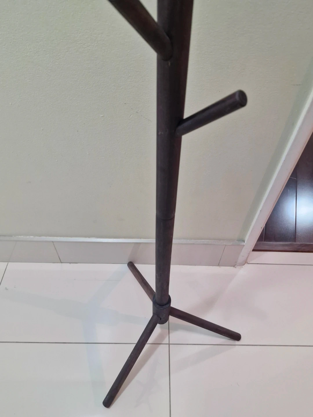 This is a dark wood coat rack with multiple branches for hanging items. It stands on a stable tripod base. It's a great way to keep your entryway tidy!