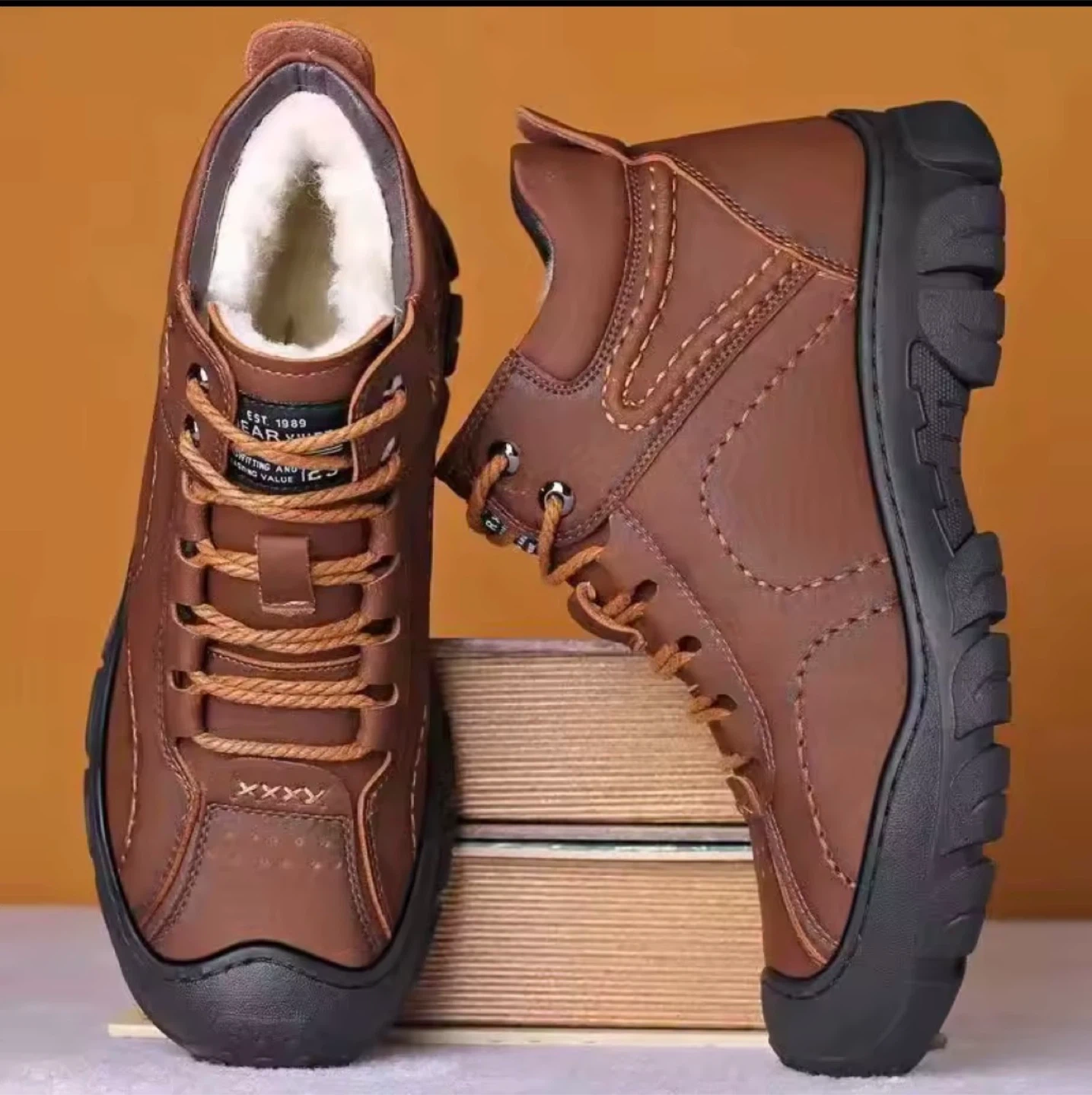Warm faux fur lined boots designed for winter comfort. They feature a durable lace-up closure and a rugged sole. Good for keeping your feet toasty on chilly days!