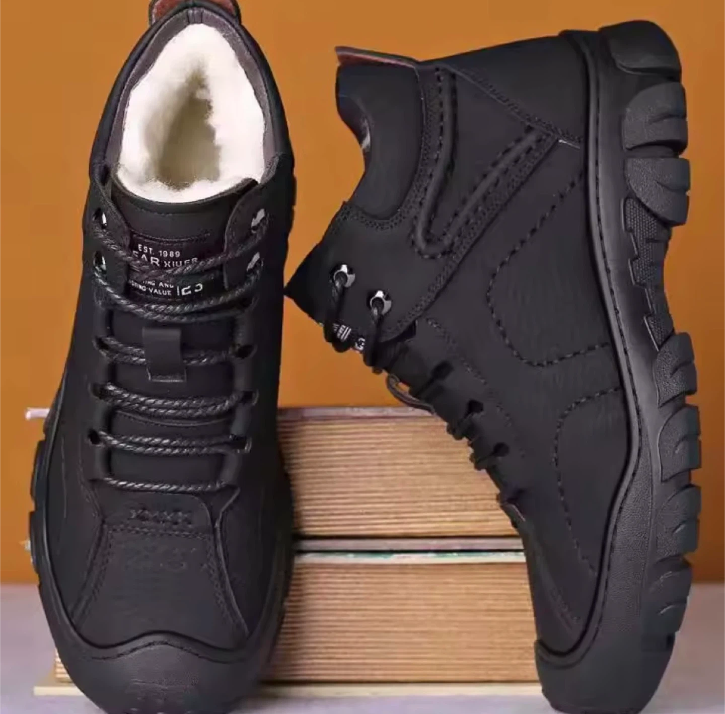 Warm faux fur lined boots designed for winter comfort. They feature a durable lace-up closure and a rugged sole. Good for keeping your feet toasty on chilly days!