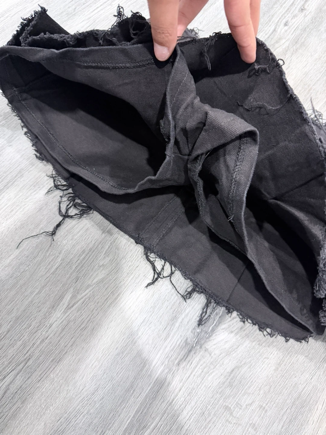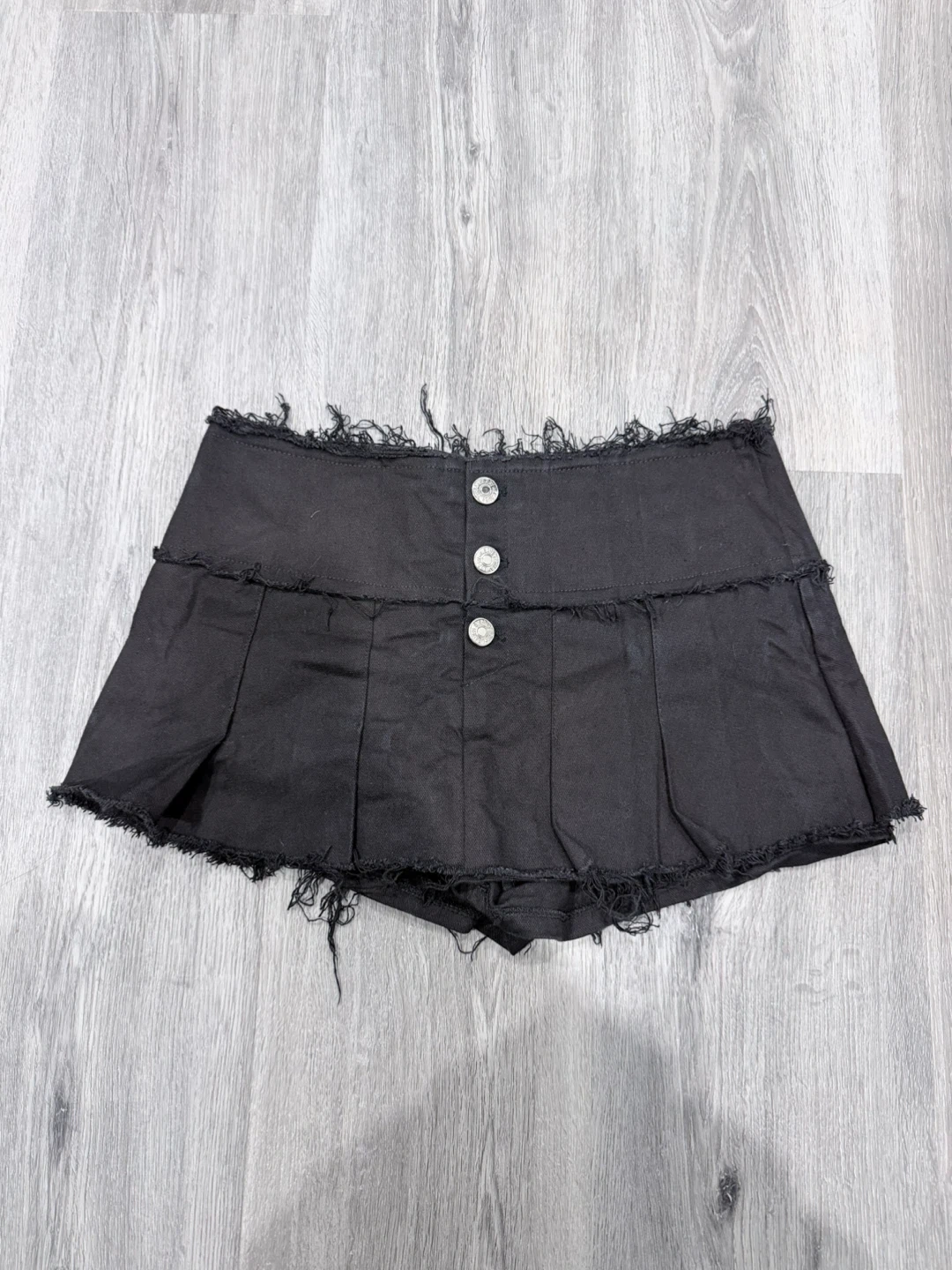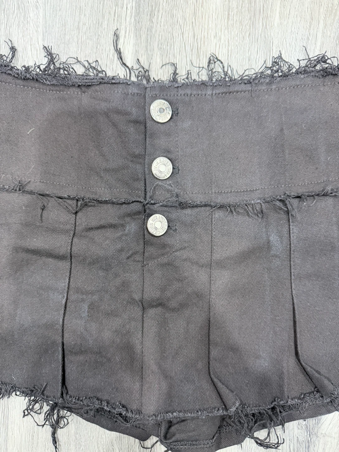 Bought in Seoul. This black mini skirt features a pleated design and distressed, frayed hem. It has a button-up front. Constructed from denim material. Never worn.