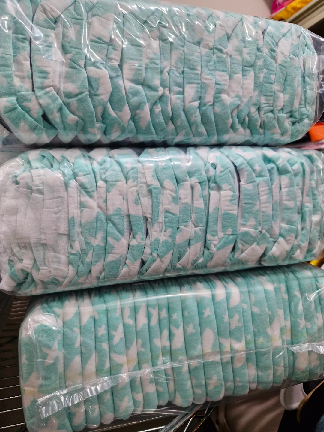 New package of Rascals diapers. These feature a cute bird print design. Comes in a sealed plastic bag. 4 bags, 200 diapers.