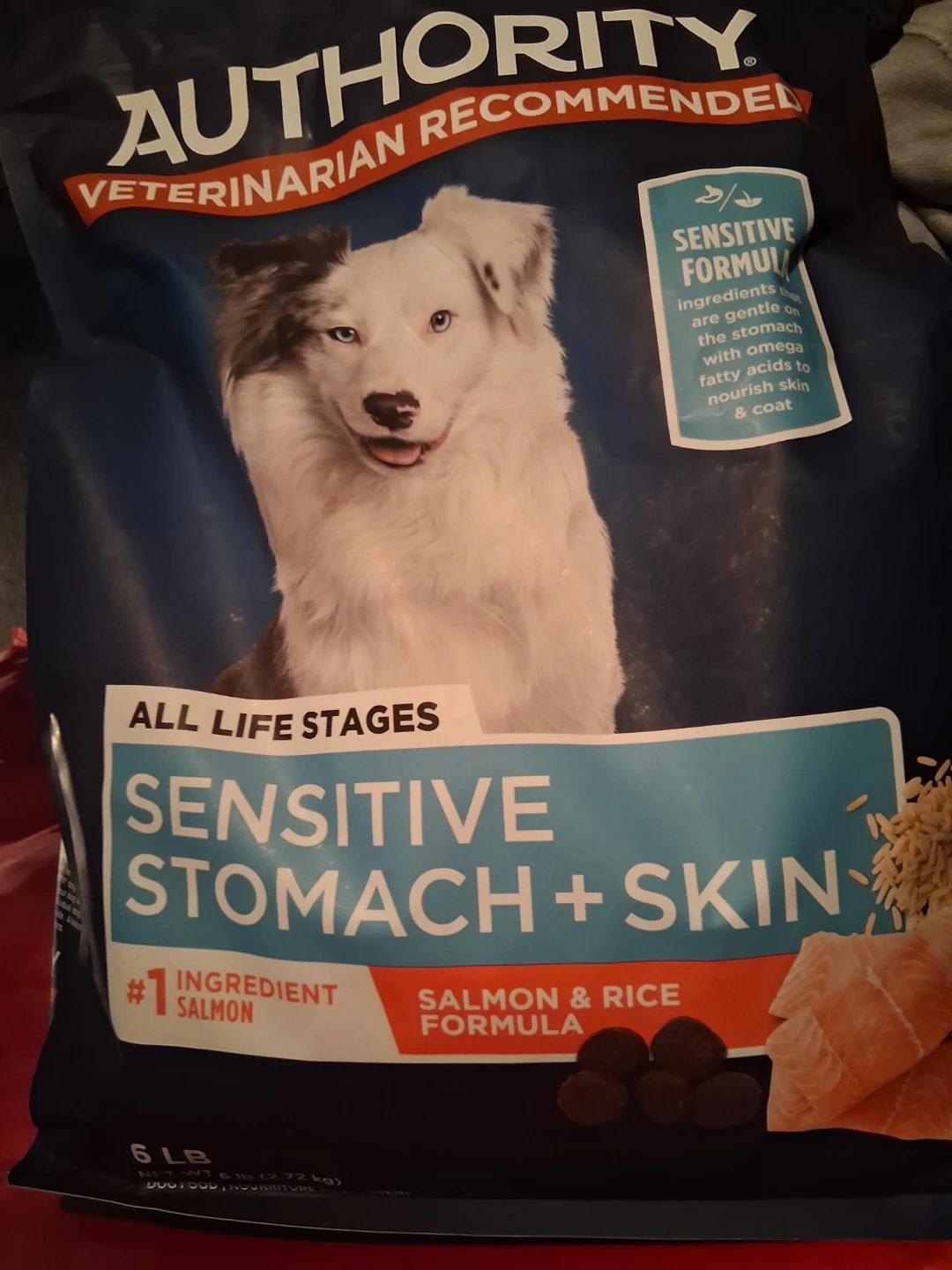 Authority Sensitive Stomach + Skin dog food features a salmon and rice formula. It's veterinarian recommended and made with ingredients gentle on the stomach. This formula is for all life stages and includes omega fatty acids to nourish skin and coat.