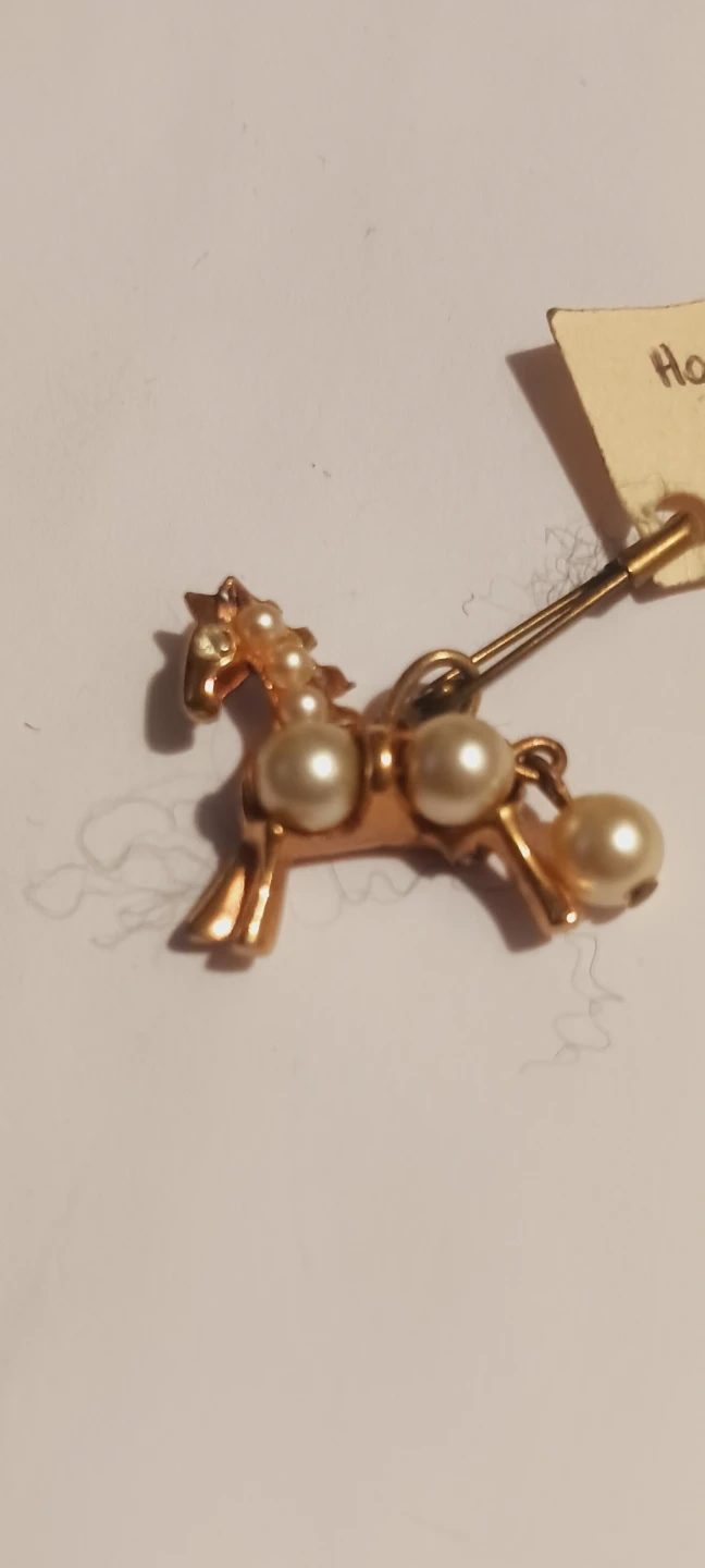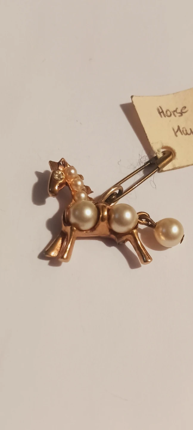 This is a cute horse-shaped pendant adorned with faux pearls. A sweet accessory for any jewelry collection! 1"×1"