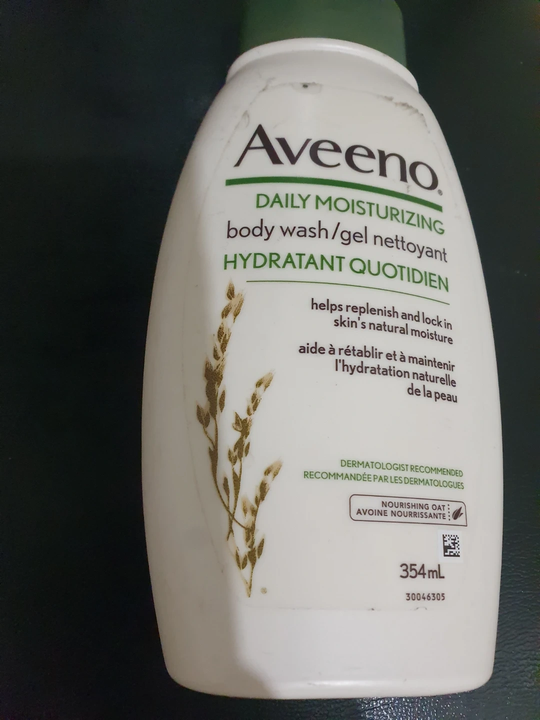Aveeno Daily Moisturizing body wash/gel nettoyant. It contains nourishing oat to help replenish and lock in skin's natural moisture. Dermatologist recommended. 354 mL bottle.