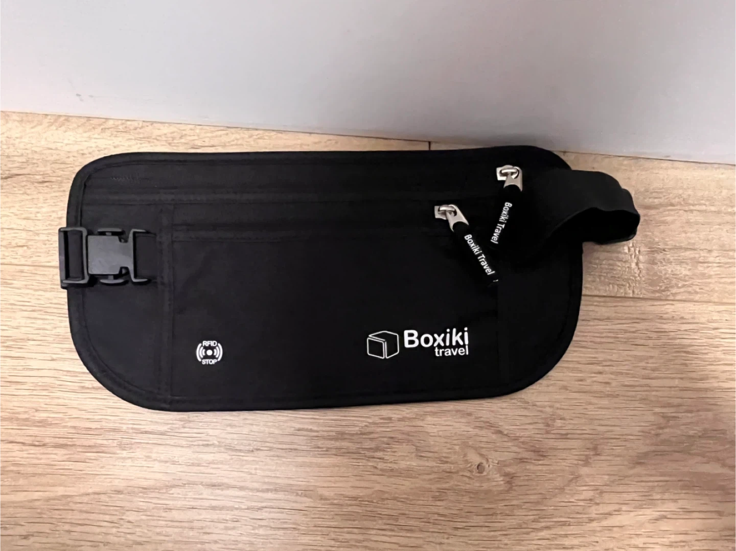 This black waist pack by Boxiki Travel offers RFID blocking technology for security. It's designed for travel to keep your essentials safe and organized. The pack features zippered pockets and an adjustable strap.