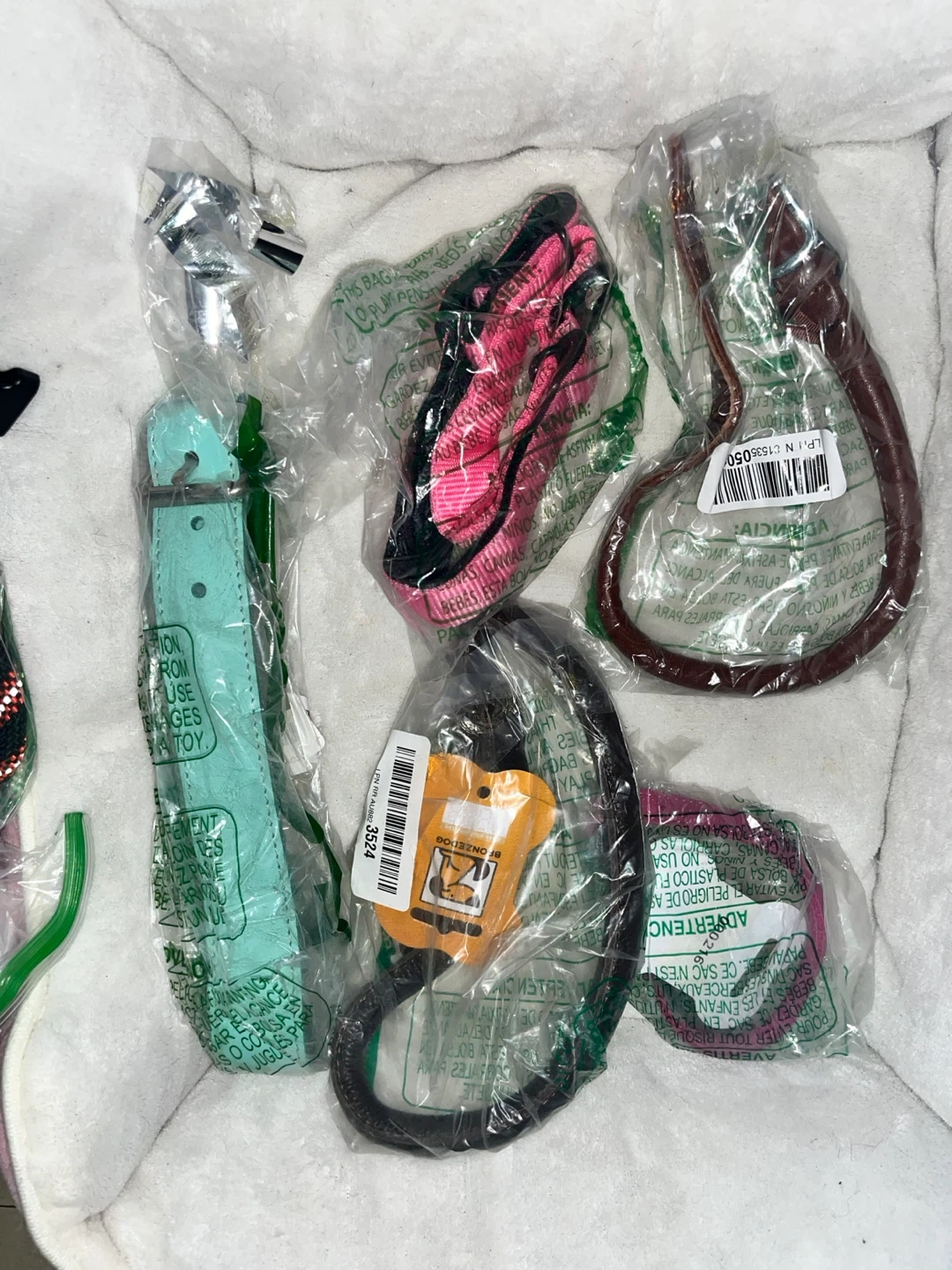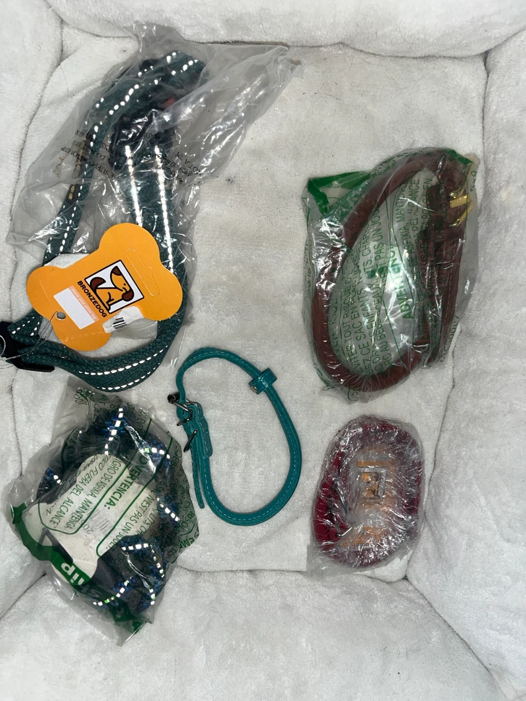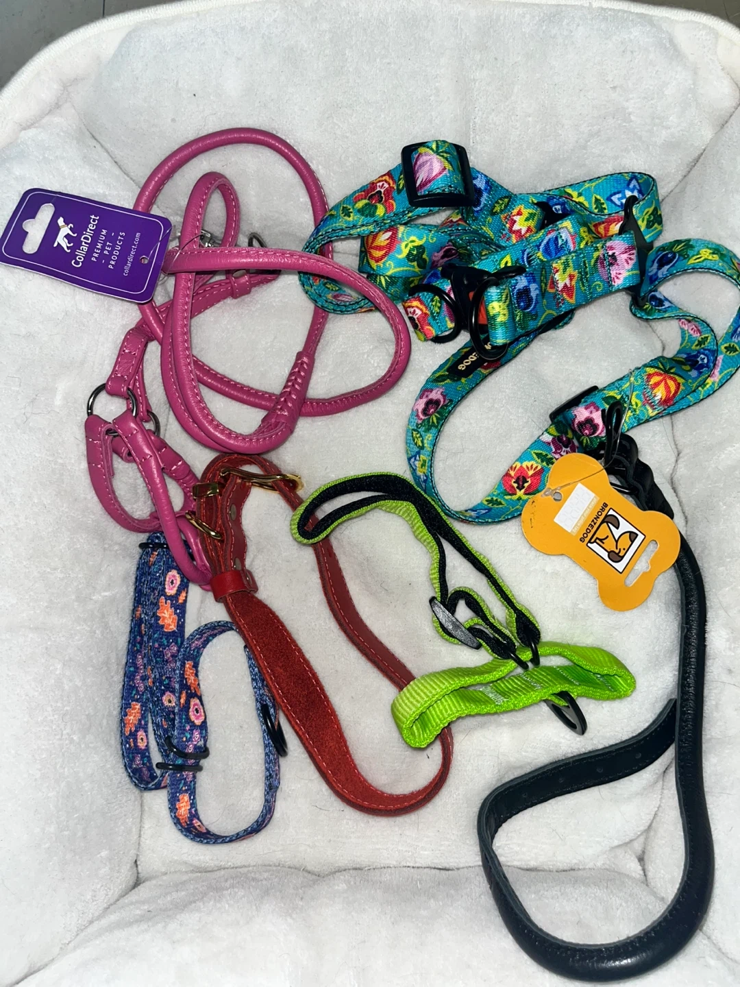 This is a collection of dog collars, leashes, and harnesses in various colors and designs. Includes leather, fabric, and nylon materials. Great for different dog sizes and styles!