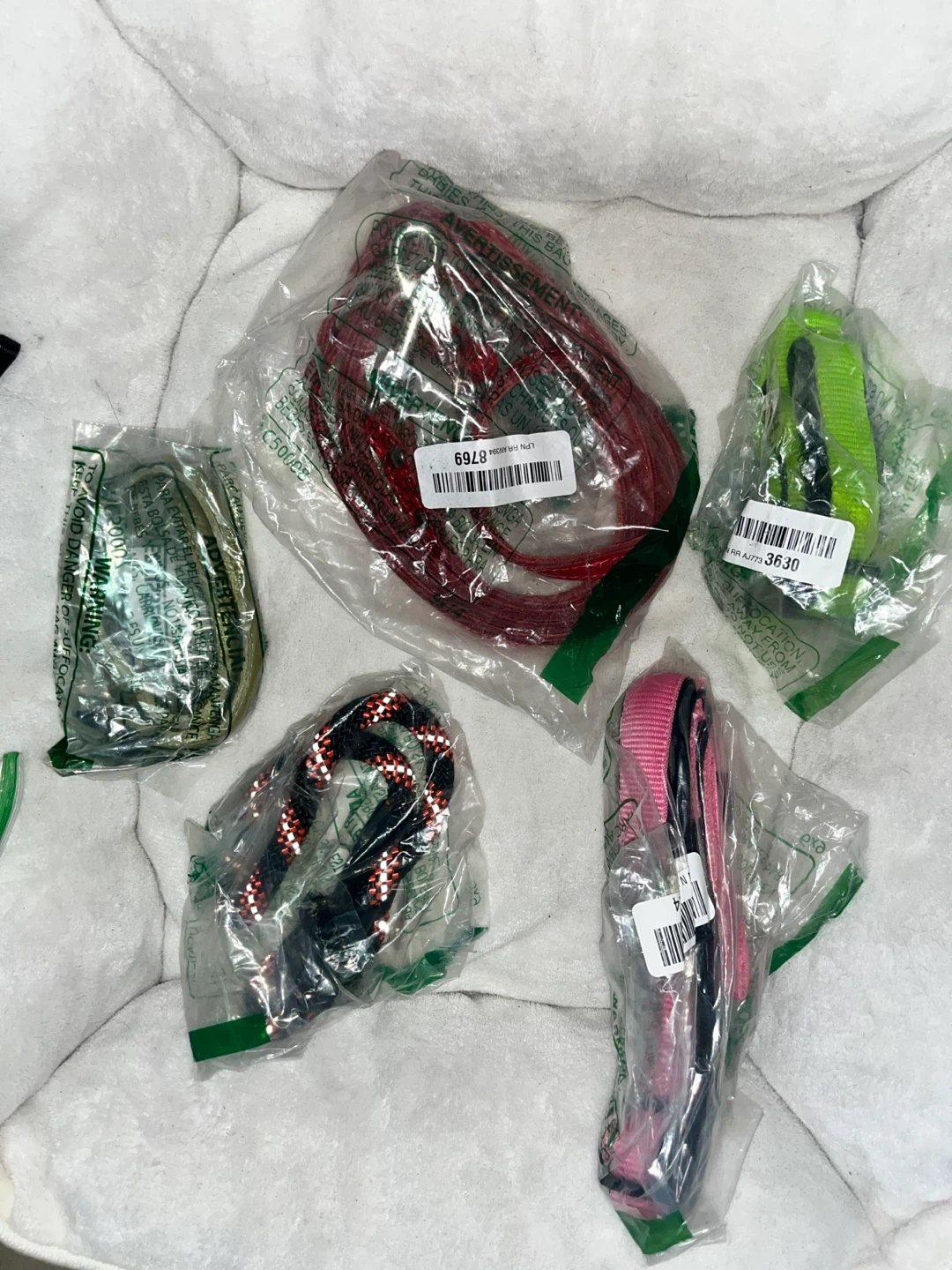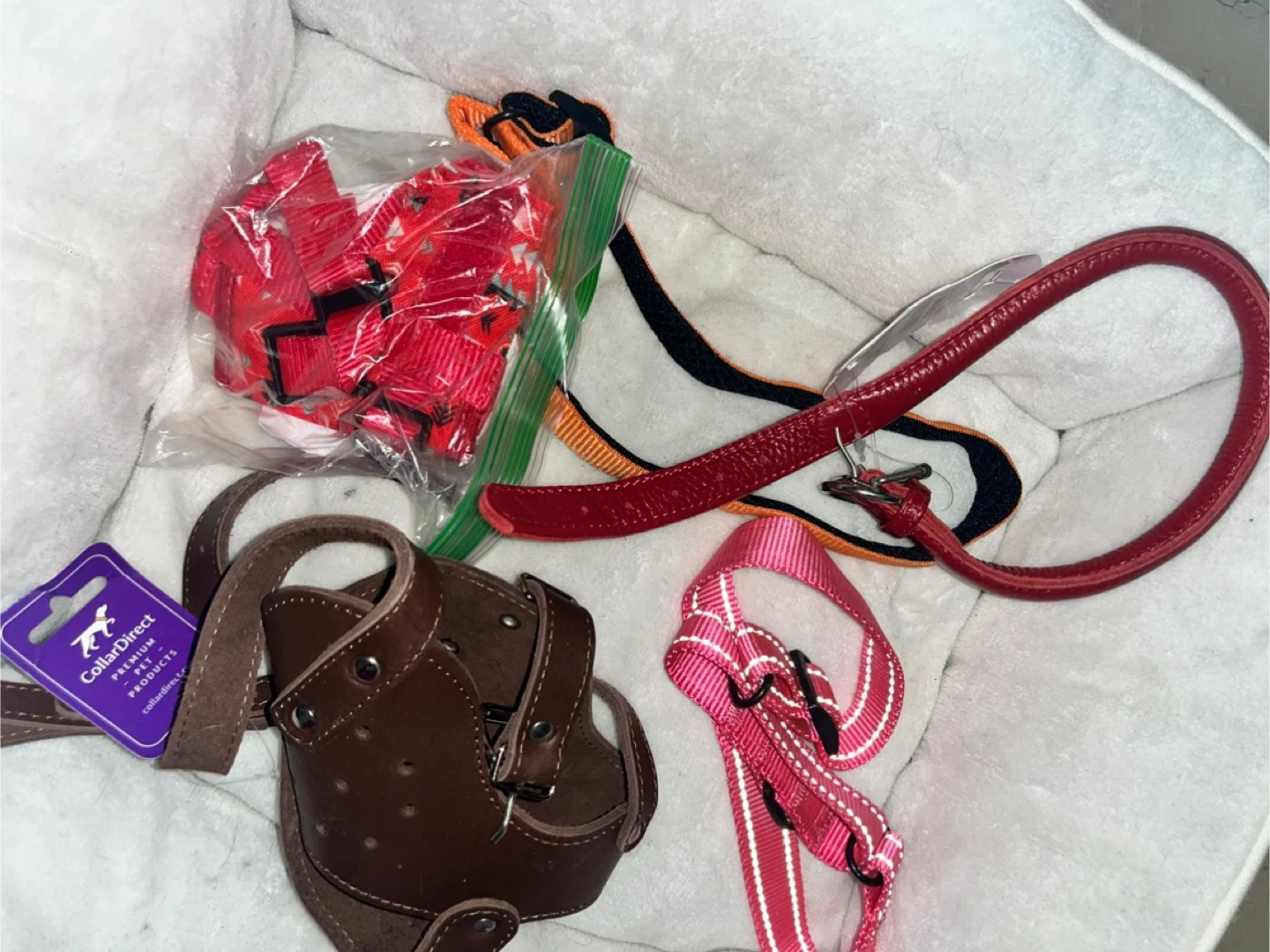 This is a collection of dog collars, leashes, and harnesses in various colors and designs. Includes leather, fabric, and nylon materials. Great for different dog sizes and styles!