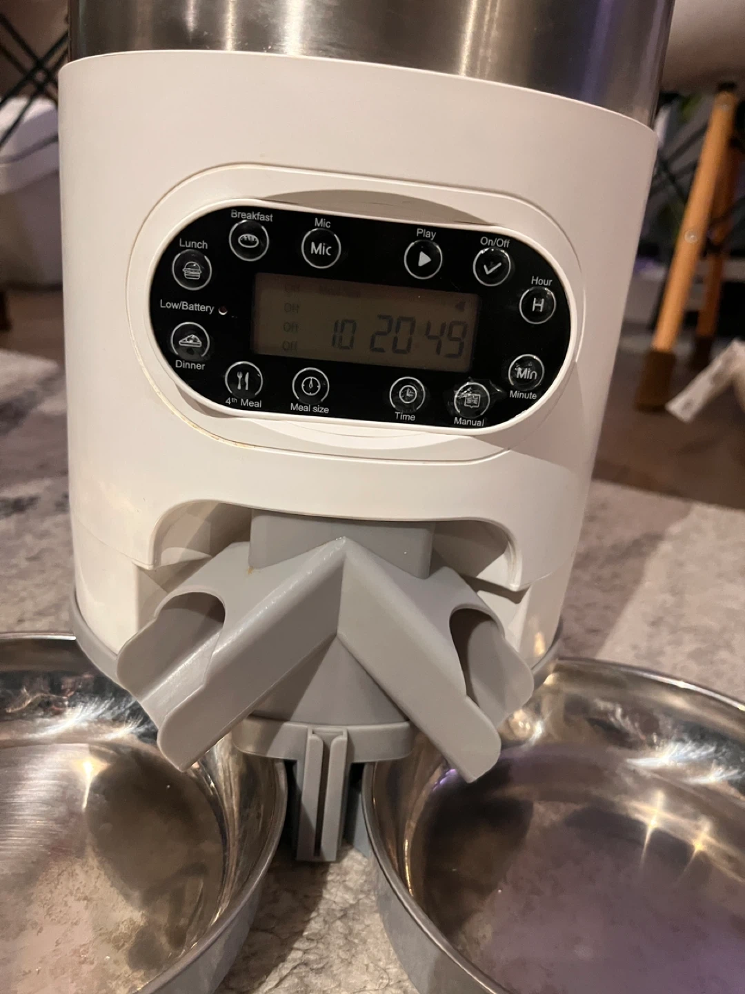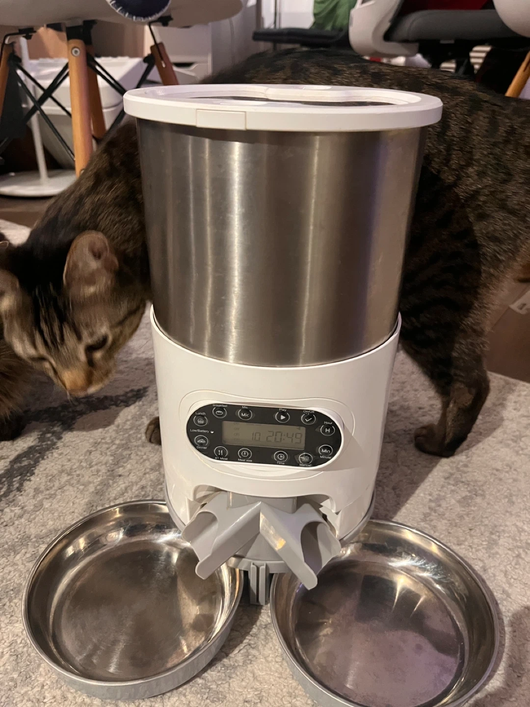 This automatic pet feeder dispenses food on a schedule you set. It has dual stainless steel bowls to serve two pets or two meals. The digital display shows the time and feeding settings. It's a convenient way to manage your pet's diet!