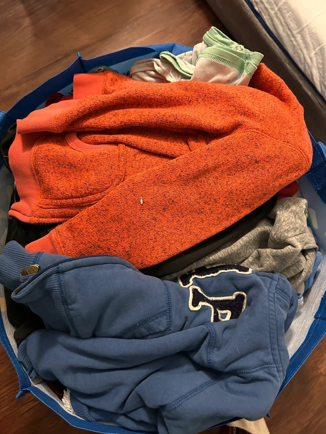 There’s lots of shirts, pants, sweaters, pyjamas, also included some swimming trunks, a vest, a couple pairs of shoes, and a snowsuit. Some clothes have stains but overall most of it still looks brand new. Sizes range from 2-4T but mainly has 3-4T