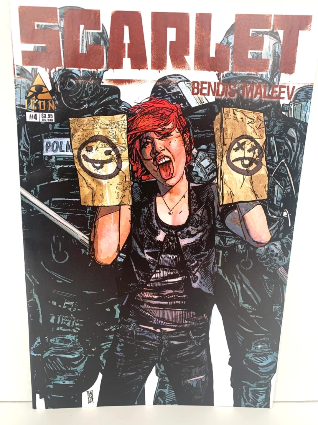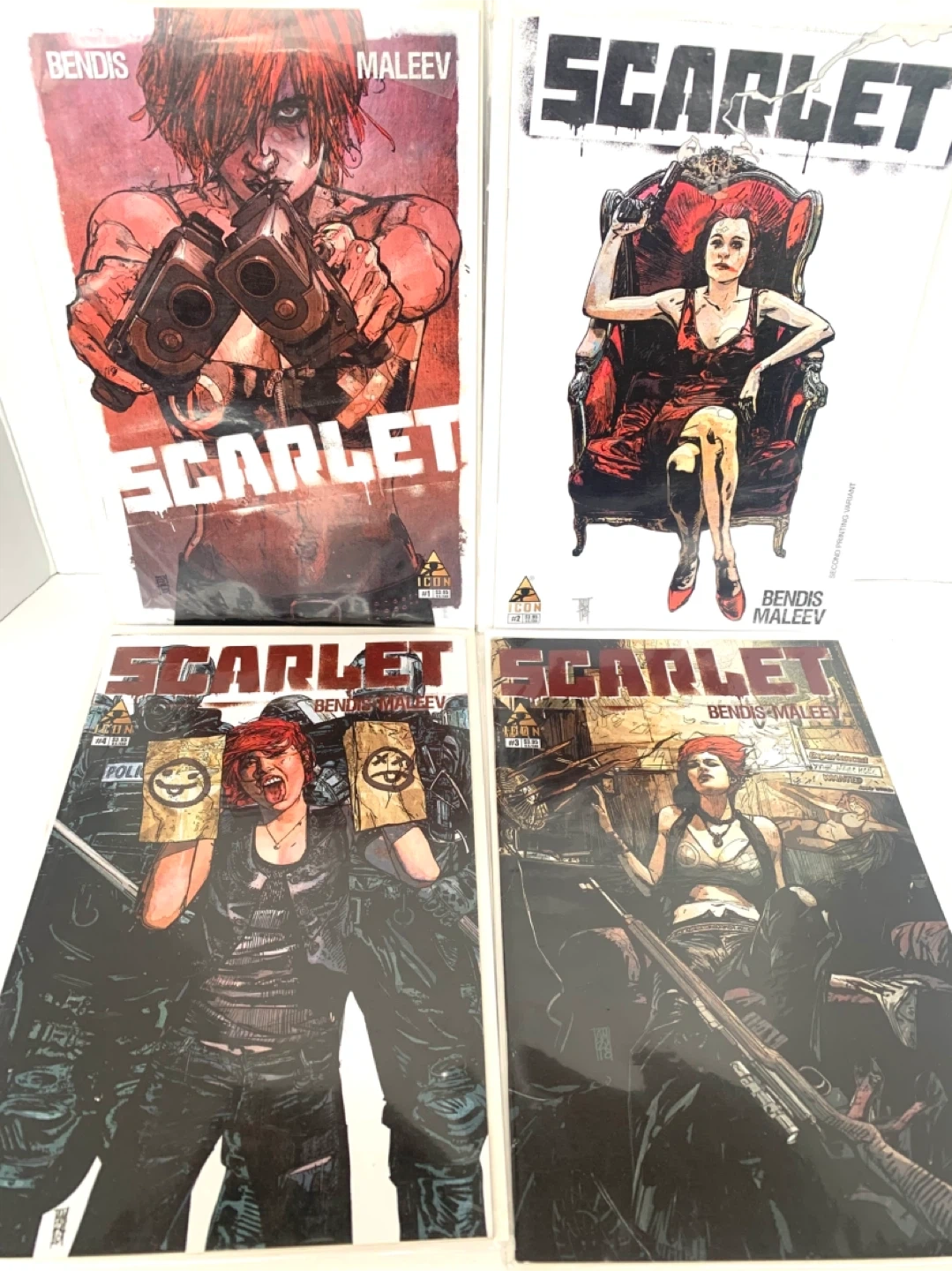 Isuues 1 through 4 of the Scarlet comic book series, featuring the work of Bendis and Maleev. These comics are published by Icon. Great for comic collectors and fans of the series!