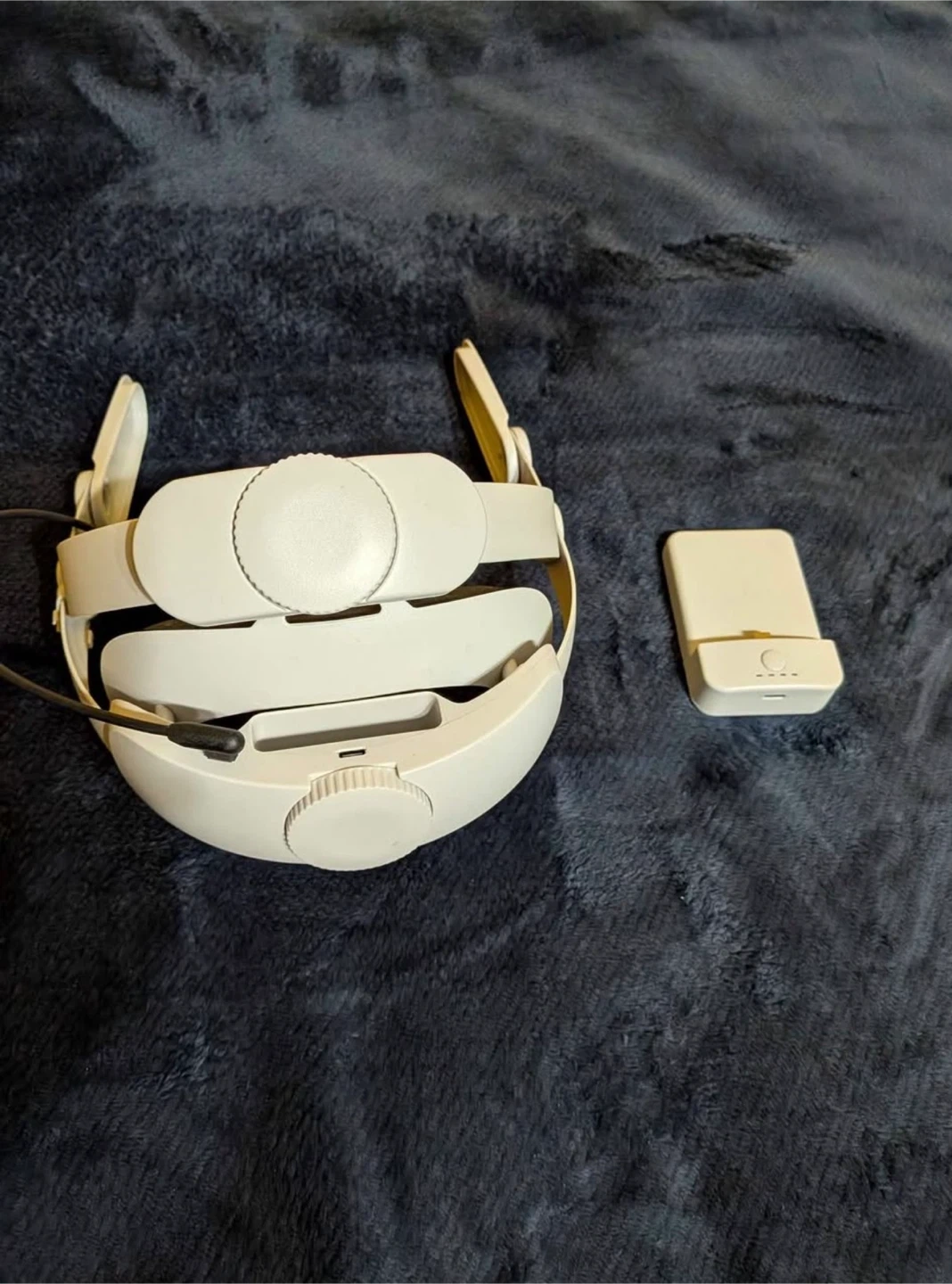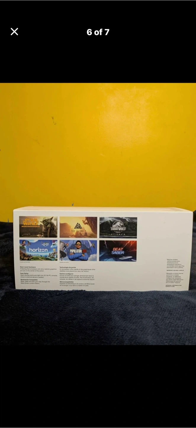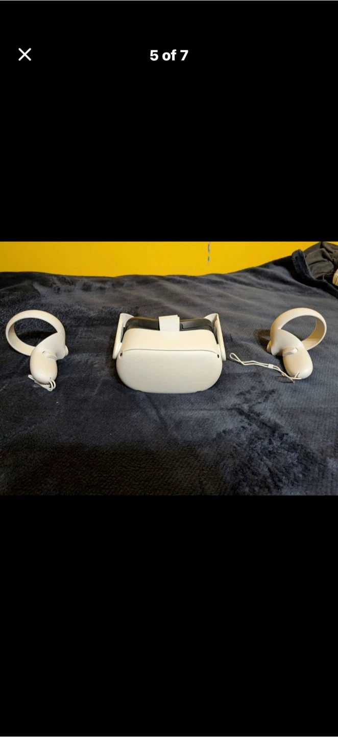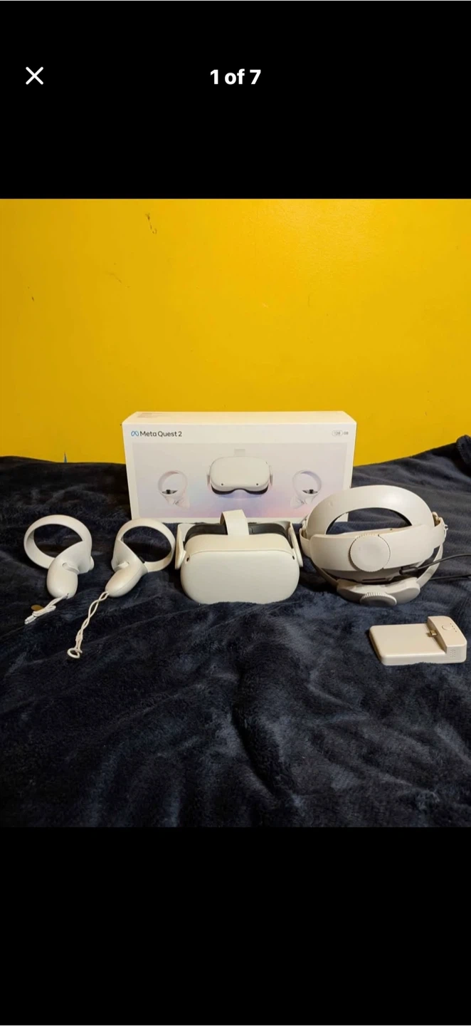 This is a complete Meta Quest 2 VR headset package. It includes the headset, controllers, head strap, and charging accessories. The original box is also included.