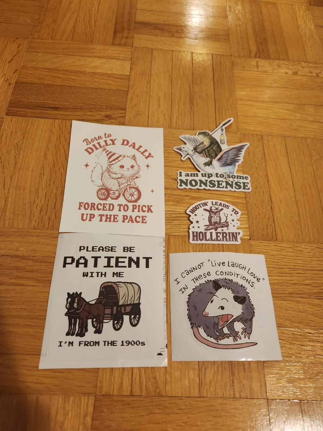 This set includes five unique vinyl stickers with humorous graphics and text. Designs feature a cat riding a bike, a frog on a goose, a rootin'-tootin' owl , and a possum freaking out. They're great for decorating laptops, water bottles, or notebooks!