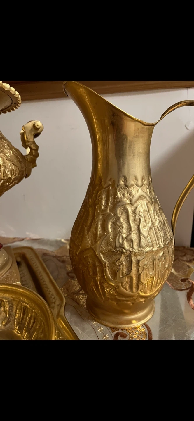 This is a beautiful ornate brass samovar set, complete with a matching pitcher and bowl. It features intricate embossed designs all over. A lovely decorative piece for any home!