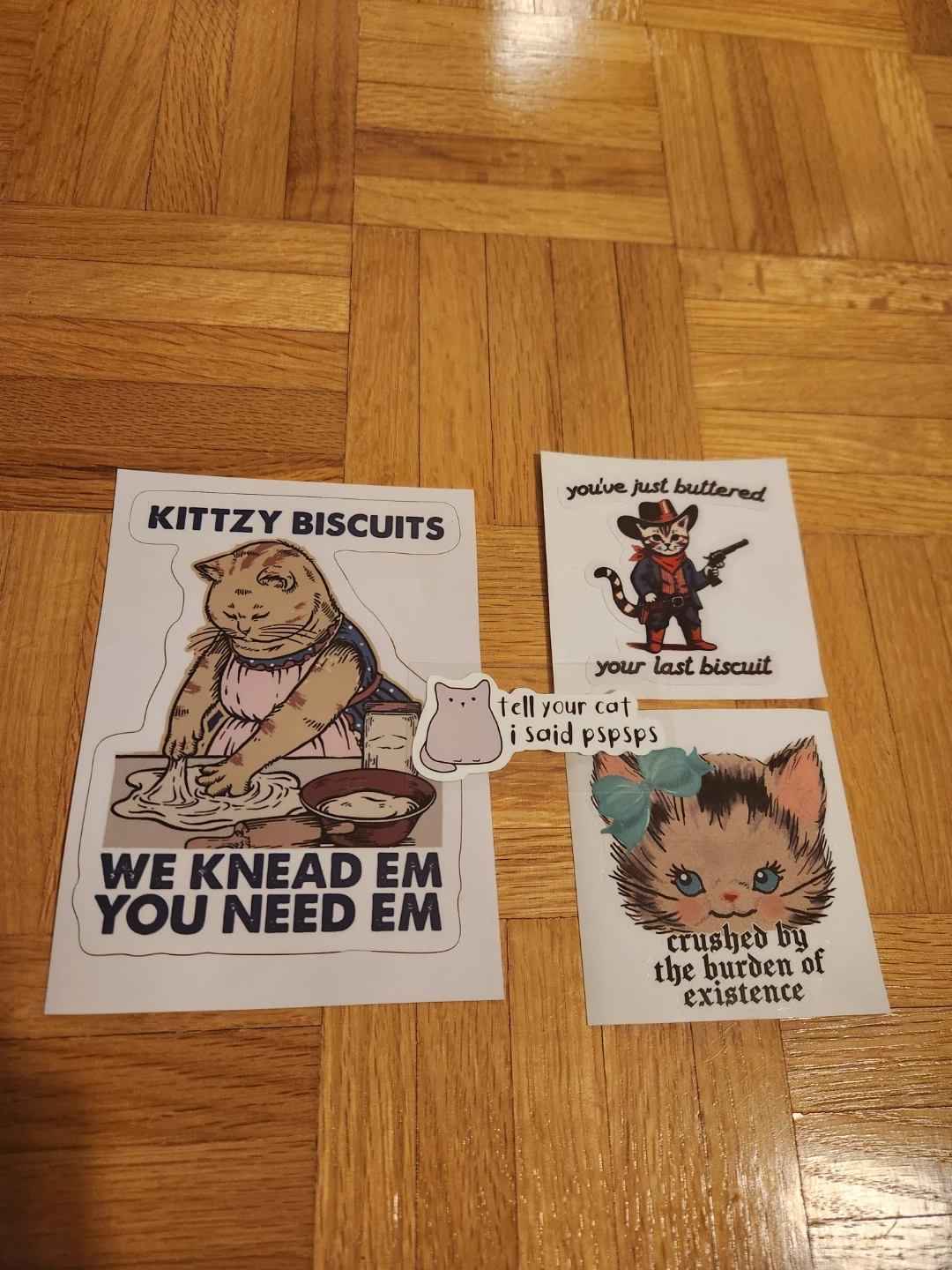 This set includes three fun stickers with cat-themed sayings. The designs feature a large "KITTZY BISCUITS WE KNEAD EM YOU NEED EM", "you've just buttered your last biscuit", and "crushed by the burden of existence". There's also a small "tell your cat i said pspsps" sticker. Perfect for personalizing laptops, water bottles, or notebooks!