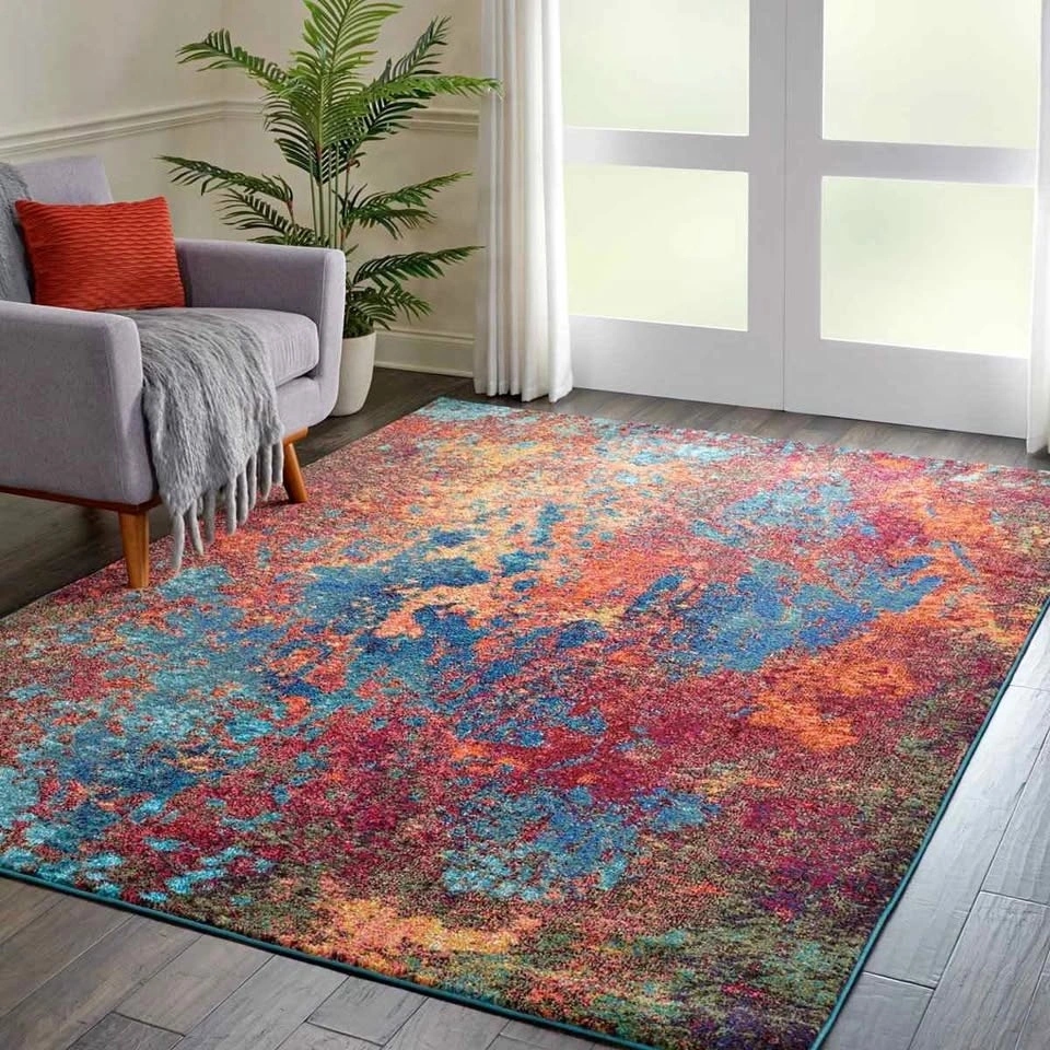 Create an eye-catching base for your stylish space with this Velva blue/red abstract rug, showcasing saturated shades of red and blue that swirl and blend together. Machine-made in Turkey, this rug is machine-woven from stain- and fade-resistant polypropylene and has a medium pile height of 0.5 inches. This rug has a durable jute backing and is most effective when used with a rug pad to prevent shifting and slipping.