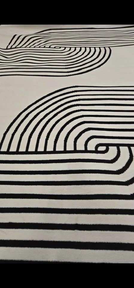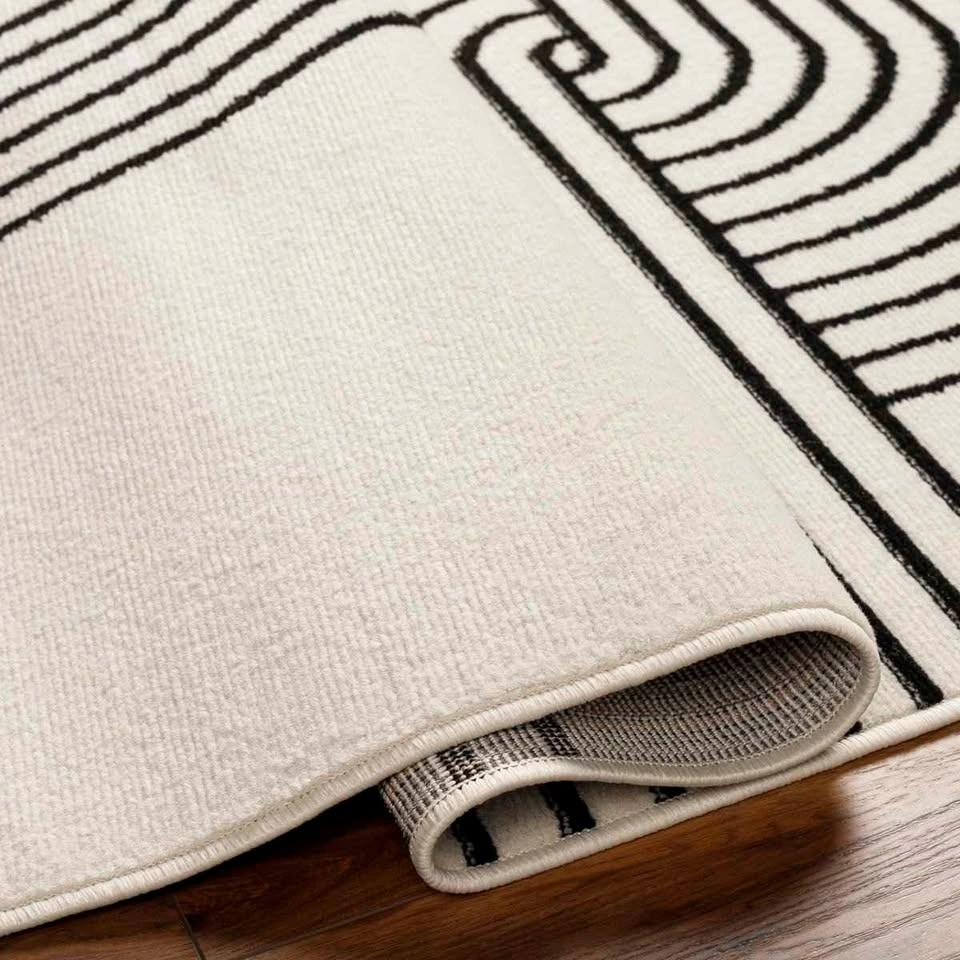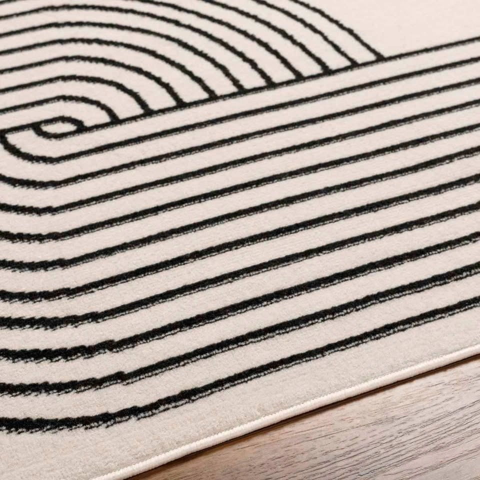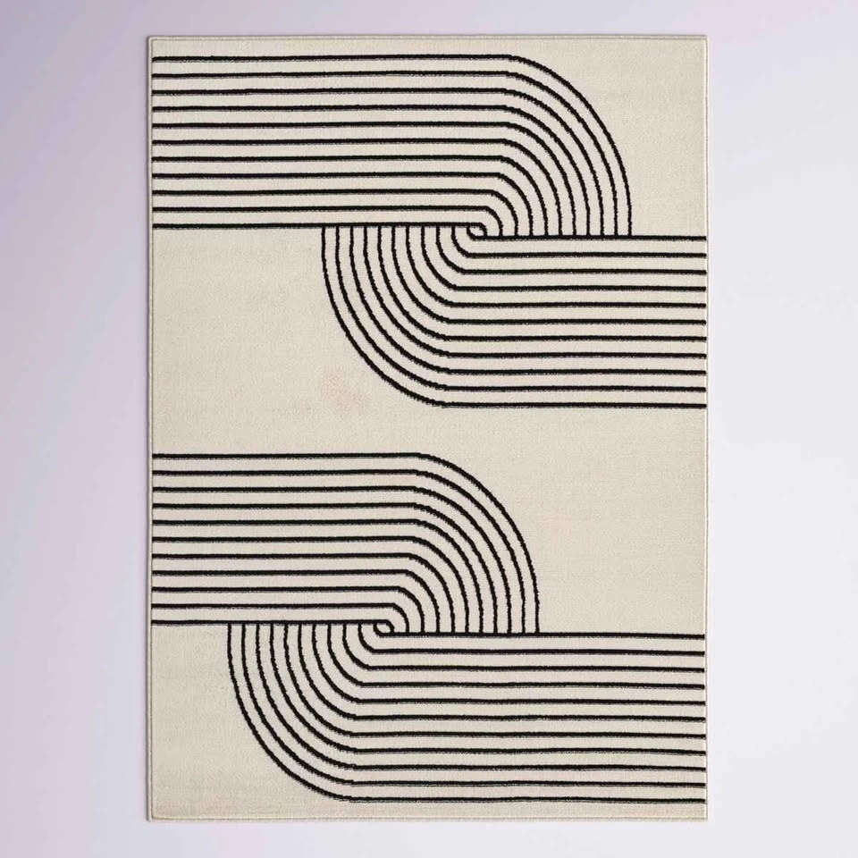 Minimalism meets fluid style with this neutral rug. Offering a contemporary feel to your office or bedroom, it features a high-low pile with curved lines that form two mirrored, rainbow-inspired geometric shapes in cream and black hues. Machine-woven from polypropylene, it has a 0.43-inch pile height to protect your floors without tripping over your feet—or your vacuum cleaner. It's also safe for use over heated floors. We recommend adding a rug pad to prevent it from shifting or sliding underfoot.