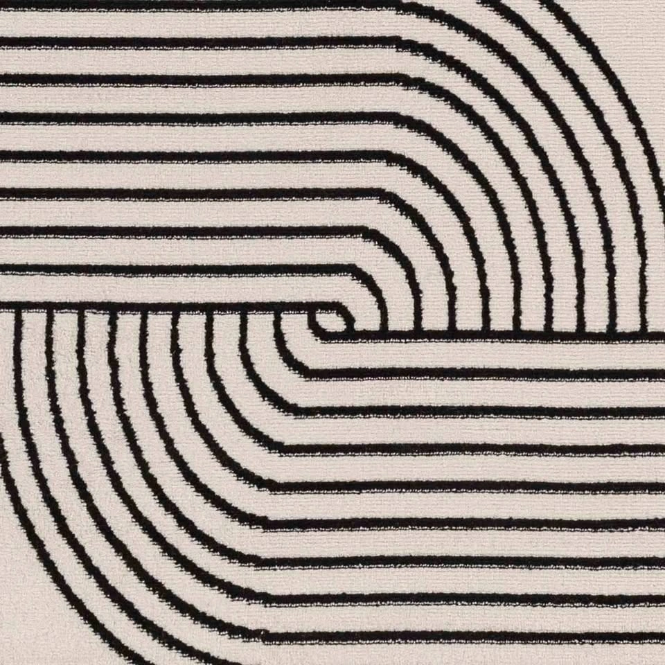 Minimalism meets fluid style with this neutral rug. Offering a contemporary feel to your office or bedroom, it features a high-low pile with curved lines that form two mirrored, rainbow-inspired geometric shapes in cream and black hues. Machine-woven from polypropylene, it has a 0.43-inch pile height to protect your floors without tripping over your feet—or your vacuum cleaner. It's also safe for use over heated floors. We recommend adding a rug pad to prevent it from shifting or sliding underfoot.