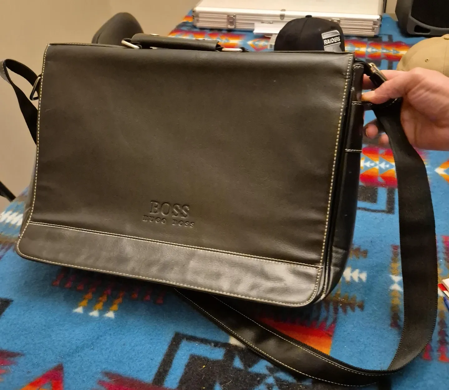 This is a black leather messenger bag by Hugo Boss. It has a classic design with contrasting white stitching. The strap is adjustable for comfort. It's perfect for carrying everyday essentials or a laptop. Selling for a friend.