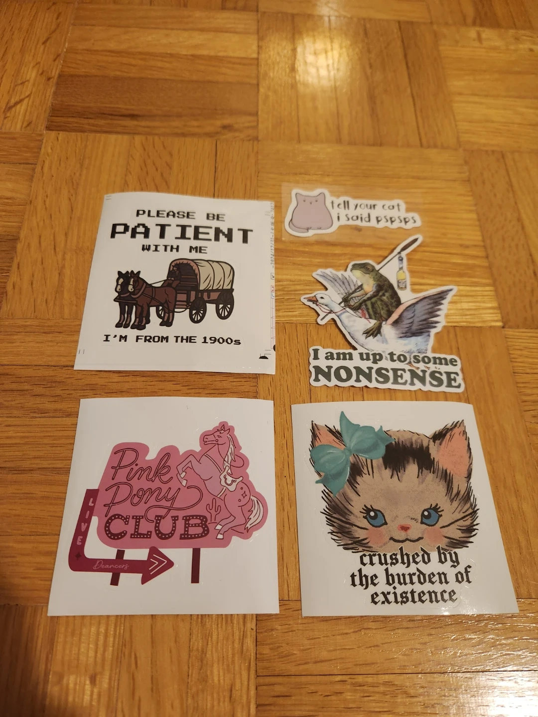 Horses, cats, geese, and frogs-oh my! Five fun stickers with various humorous and retro designs. They're great for personalizing laptops, water bottles, or journals!