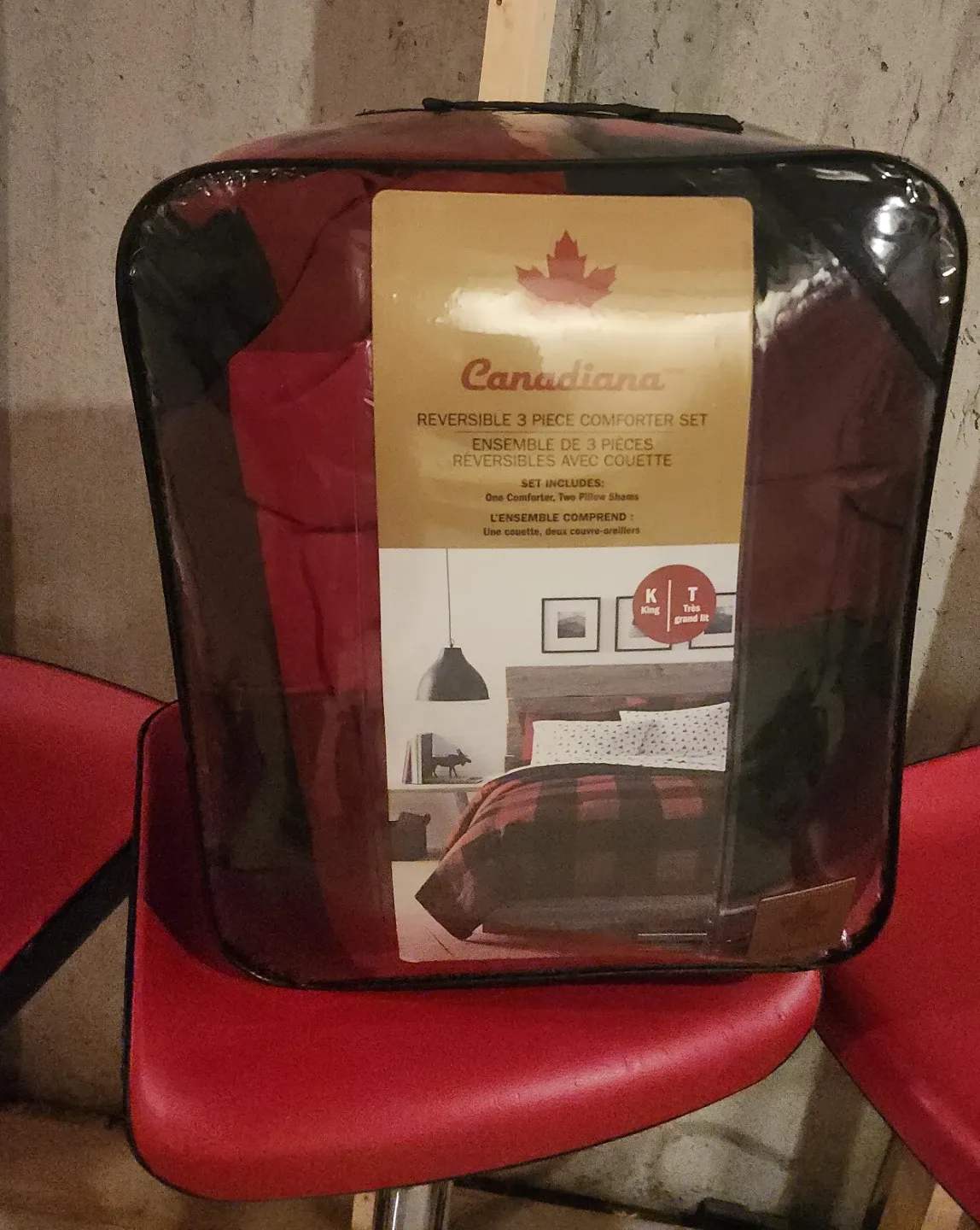 **Urgent Moving Salr**This is a Canadiana reversible 3 piece comforter set. It includes one comforter and two pillow shams. The set is a king size.Never used.