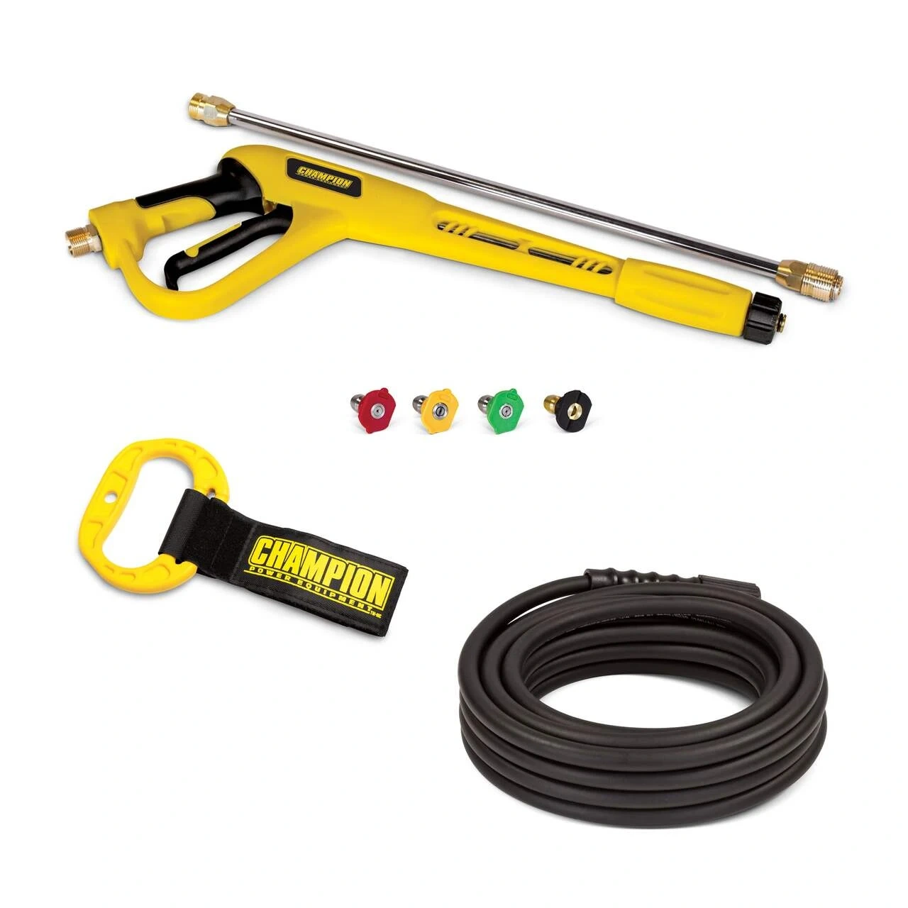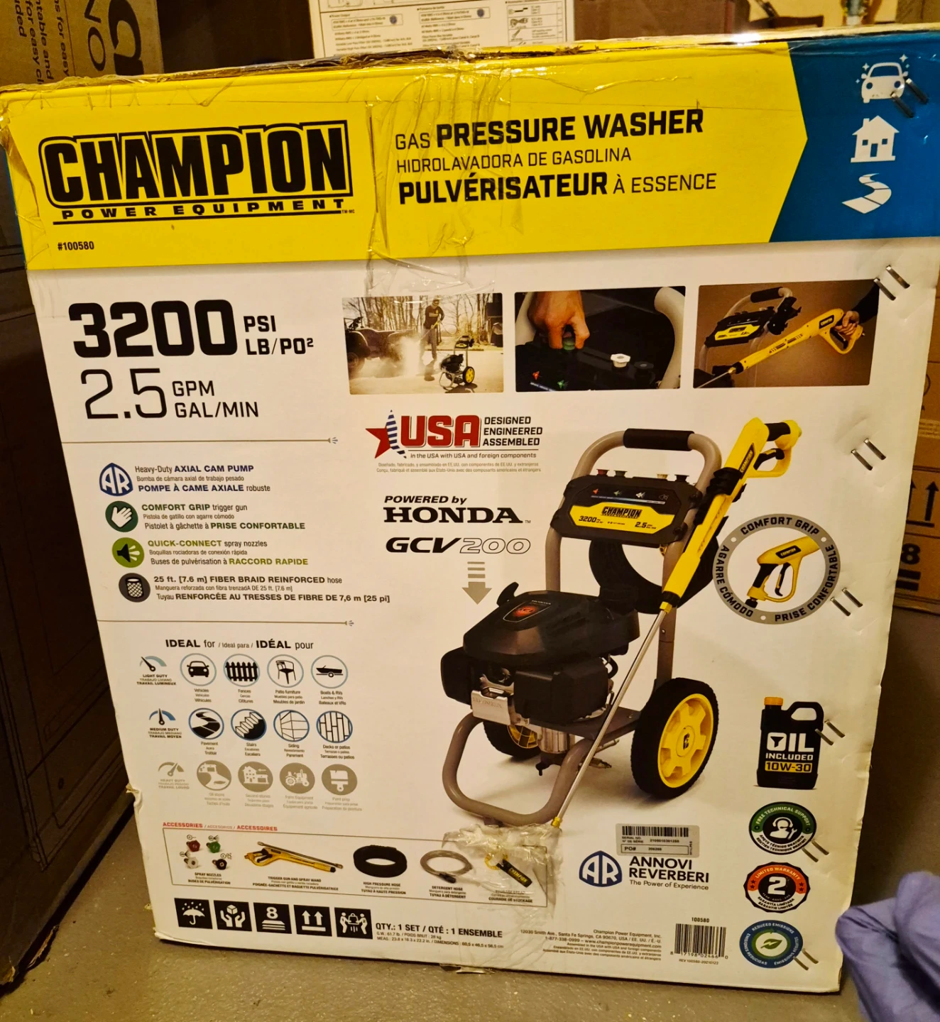 The Champion Power Equipment 100580 3200-PSI 2.5-GPM Low Profile Gas Pressure Washer provides cost-effective, “do-it-yourself” cleaning power. The combination of practical features with high-performance components results in better cleaning with less effort for all your outdoor projects. This 3200-PSI pressure washer performs well under pressure no matter what the job. Whether your outdoor cleaning project involves your patio, deck, outdoor furniture, siding, fence, driveway, car, truck, boat, RV, farm equipment or something else, Champion’s low profile pressure washer is designed for performance. It’s important to have the right nozzle for the job, since the size of the nozzle affects water flow and pressure. The four quick-connect nozzles (0˚, 25˚,40˚, soap) ensure maximum cleaning performance for any type of job. Extend your reach with the included 25-foot high-pressure hose. The Annovi Reverberi heavy-duty axial cam pump is designed for high performance and long pump life, and will ensure consistent cleaning performance for everyday jobs. Champion’s low profile design along with the 12-inch wheels make this pressure washer easy to maneuver. The handy hose storage strap plus onboard storage for the rubber high-pressure hose, trigger gun and spray wand ensure you’ll have what you need when you need it, plus you’ll be able to keep moving without having to stop and put things away. The durable steel frame is built to last. Powered by a 201cc Honda GCV200 engine with a 0.2-gallon fuel tank, this unit has a 0.4 qt. oil capacity (recommended 10W-30 plus funnel are included). This pressure washer is EPA and CARB certified. Buy with confidence - Champion Support and our nationwide network of service centers will back your purchase up with a 2-year limited warranty and FREE lifetime technical support.