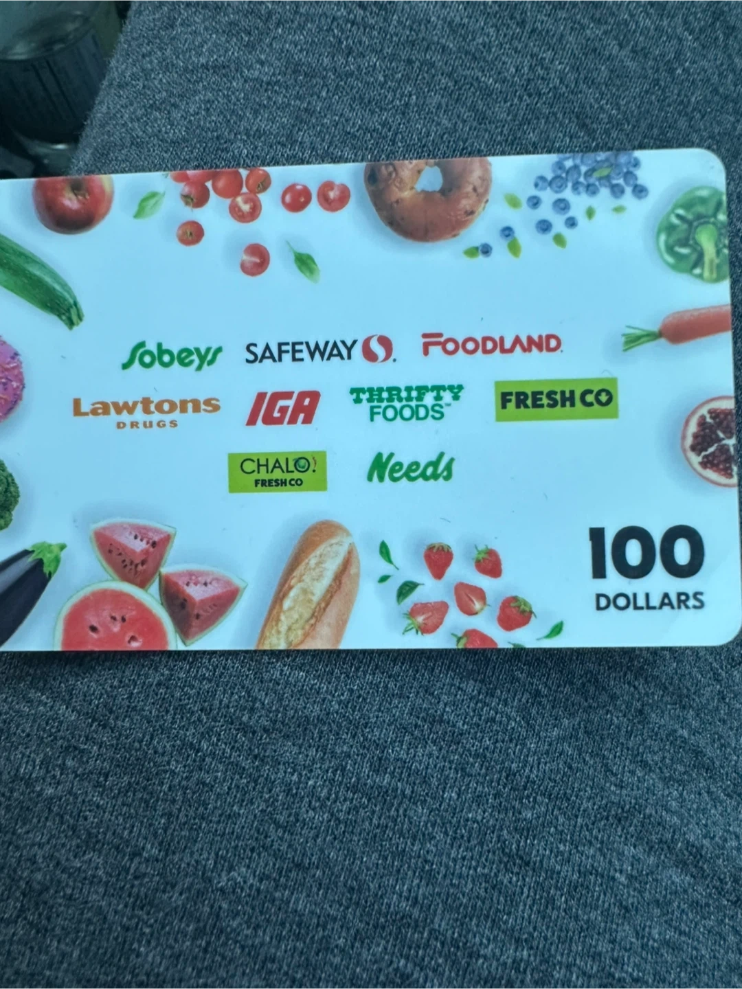 This is a $100 gift card valid at Sobeys, Safeway, IGA, Foodland, Lawtons Drugs, Thrifty Foods, Fresh Co, Chalo Fresh Co, and Needs. It's a great option for stocking up on groceries or everyday essentials!