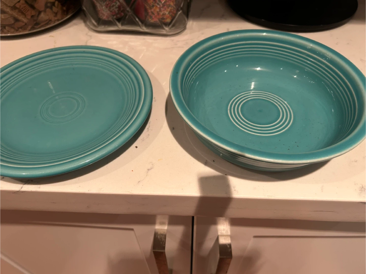 This is a set of Fiesta Homer Laughlin plates and bowls. They are made in the USA. This durable ceramic tableware is lead-free.price is for each piece. YELLOW AND GREEN SOLD