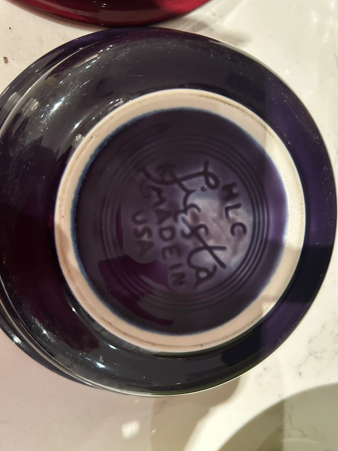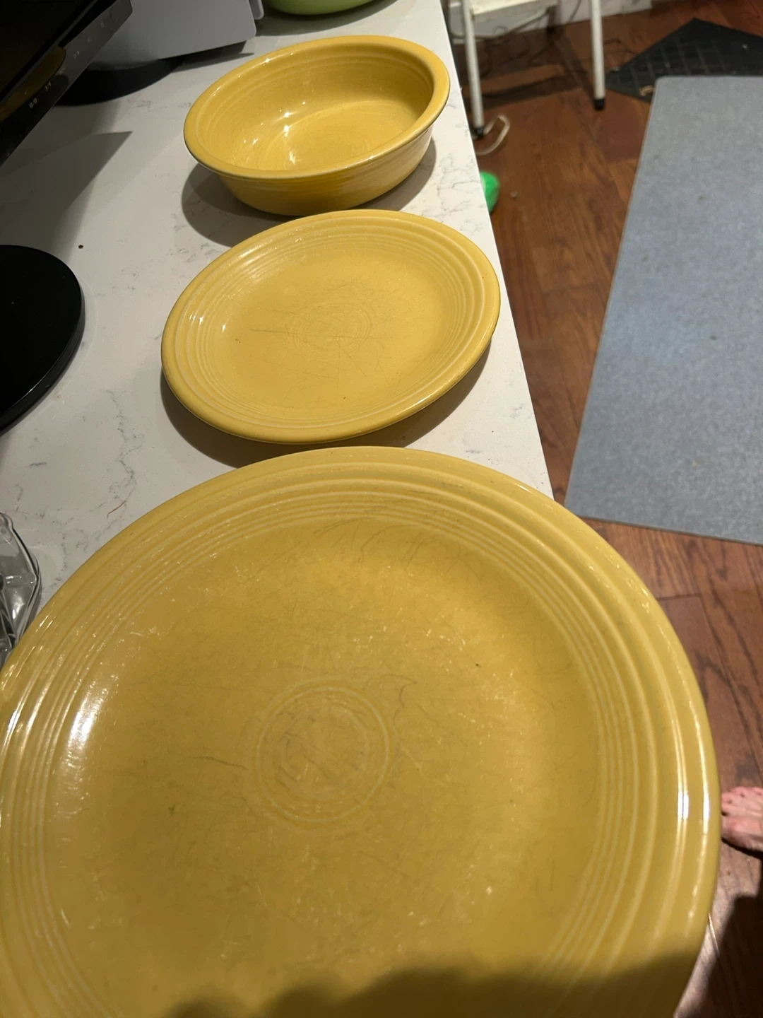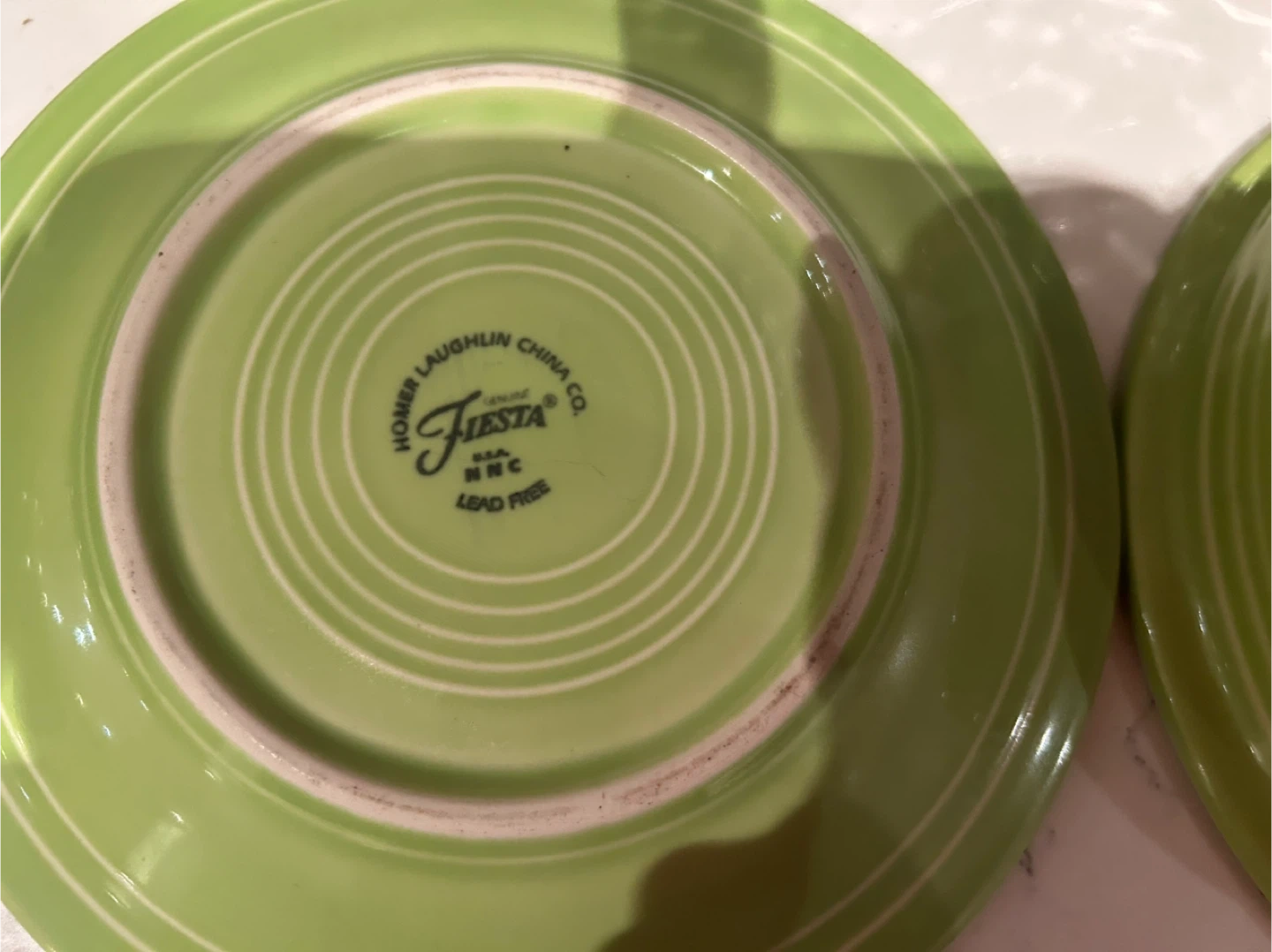 This is a set of Fiesta Homer Laughlin plates and bowls. They are made in the USA. This durable ceramic tableware is lead-free.price is for each piece. YELLOW AND GREEN SOLD