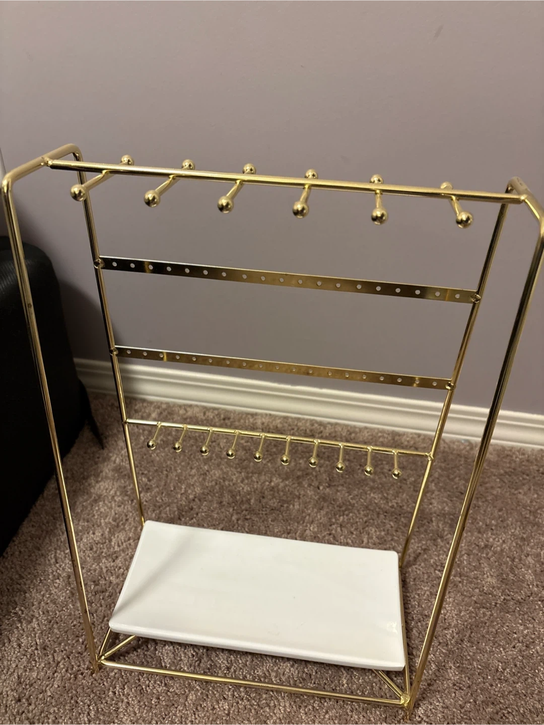 This jewelry organizer stand is gold metal with a white tray at the bottom. It has multiple tiers and hooks for hanging earrings, necklaces, and bracelets. Keep your accessories tidy and on display!