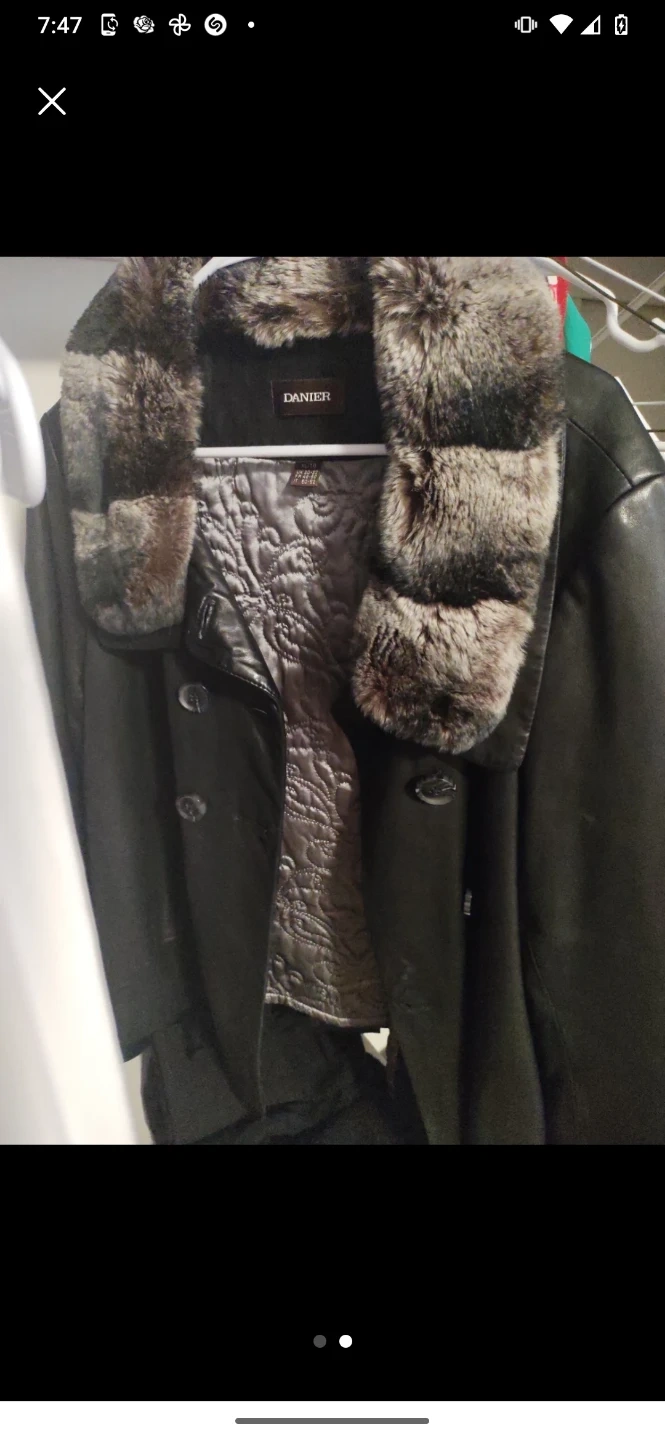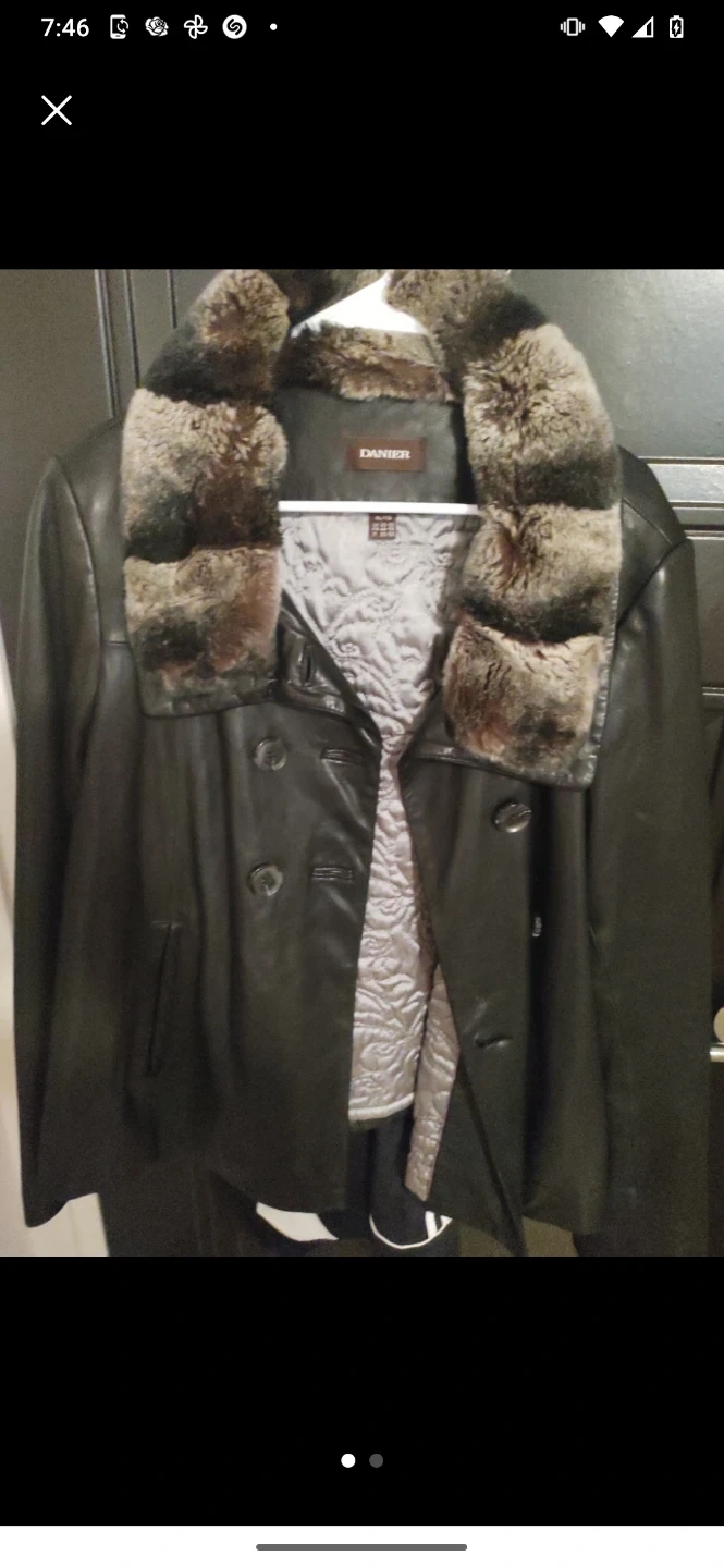This DANIER jacket is crafted from genuine leather and features a plush fur collar. It's lined with a patterned quilted fabric. It has a double-breasted button closure.