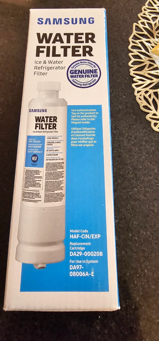 This is a Samsung ice and water refrigerator replacement filter. It's certified by NSF International. The filter has a capacity of 300 gallons and lasts for 6 months or 600 gallons. It's designed for use in Samsung French Door/4 Door Flex and Side by Side refrigerators.