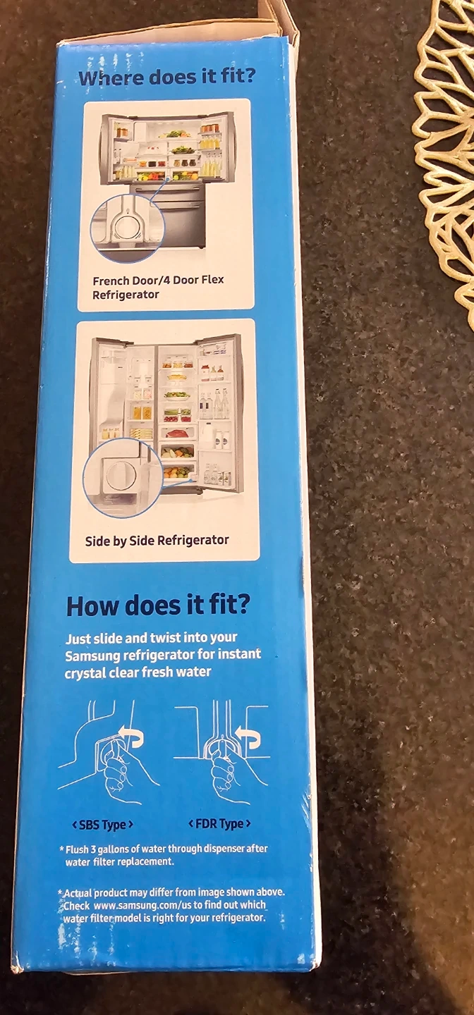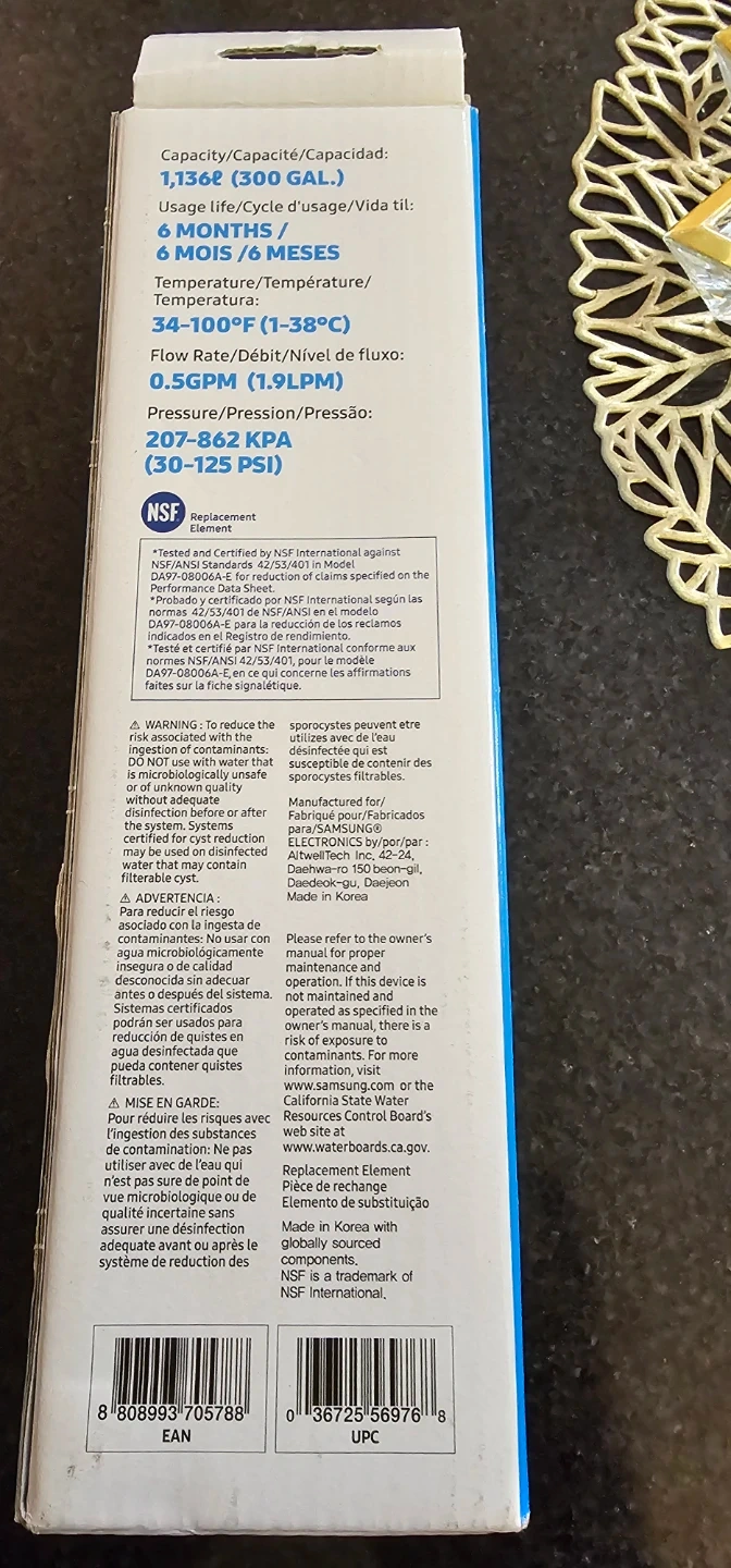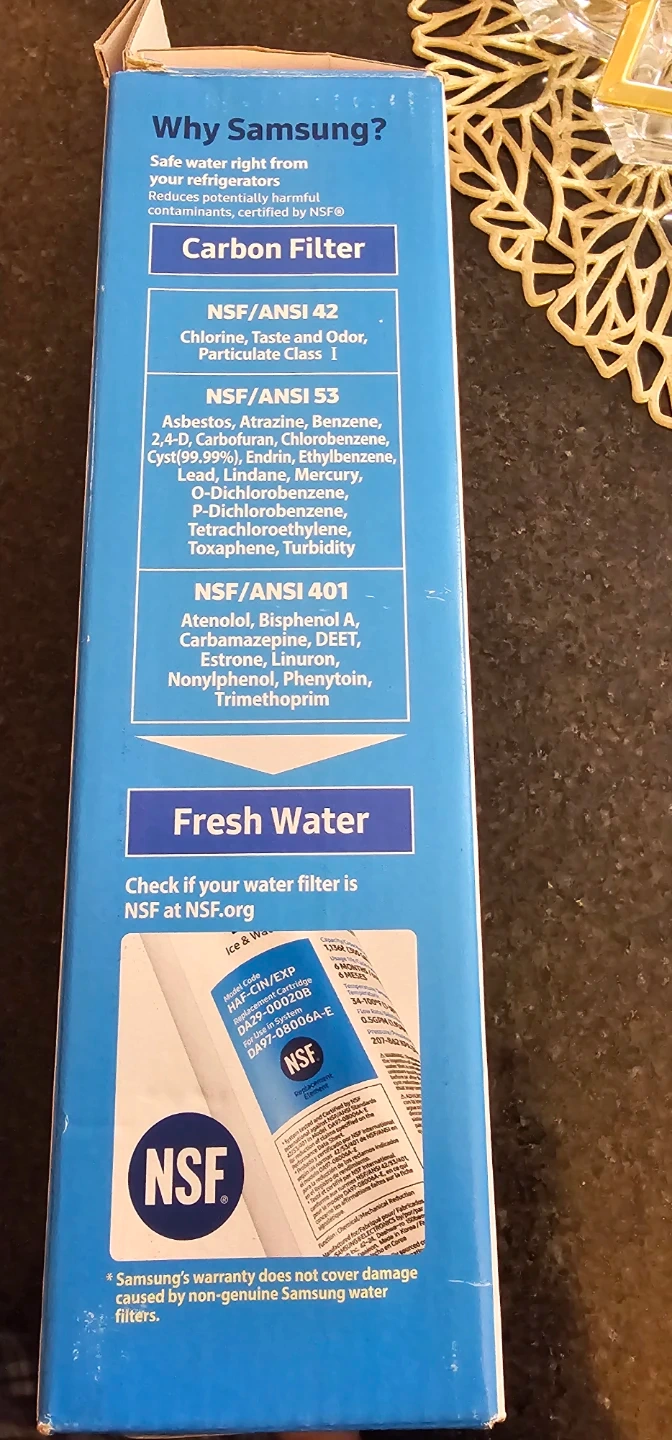 This is a Samsung ice and water refrigerator replacement filter. It's certified by NSF International. The filter has a capacity of 300 gallons and lasts for 6 months or 600 gallons. It's designed for use in Samsung French Door/4 Door Flex and Side by Side refrigerators.