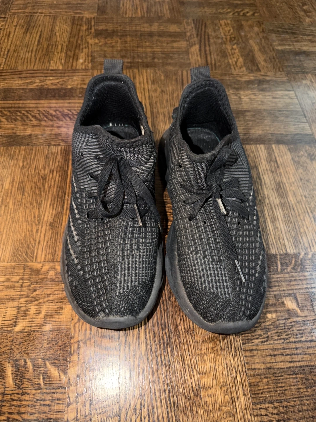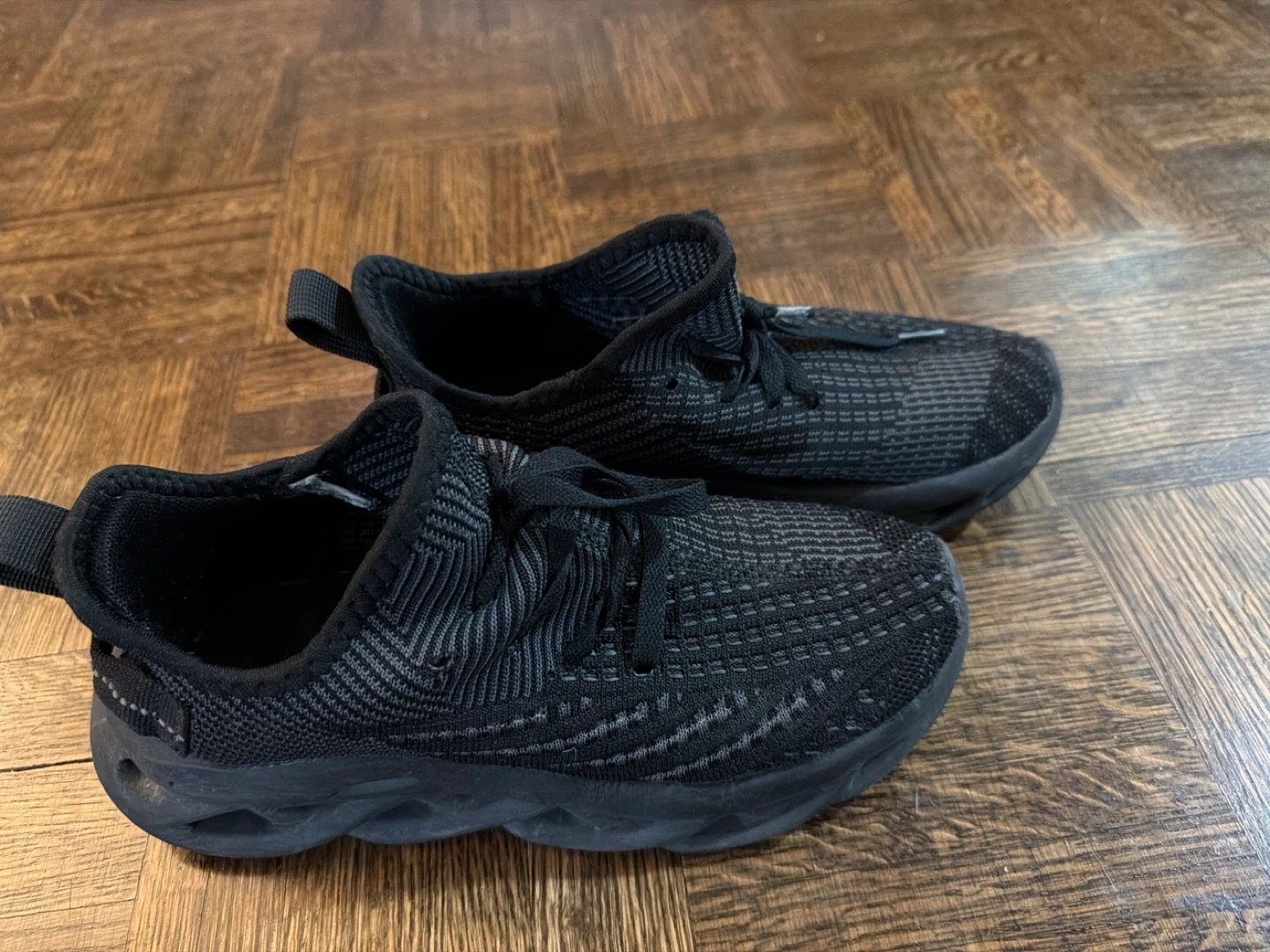 A pair of black athletic shoes with a textured knit upper and lace-up closure. They feature a supportive sole design. These shoes are suitable for everyday wear or light athletic activities.